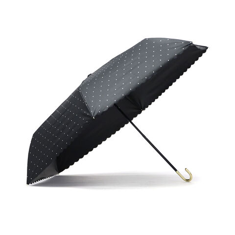 目を惹くドット柄 大きめサイズで紫外線をしっかりガードしてくれるドット柄がかわいい折り畳み日傘。スカラップのフチがガーリーなデザインで、ゴールドのフラワーボタンがワンポイントに。曲がり手元で持ちやすく、3段式の骨を採用した使い勝手の良いアイテムとなっています。 |