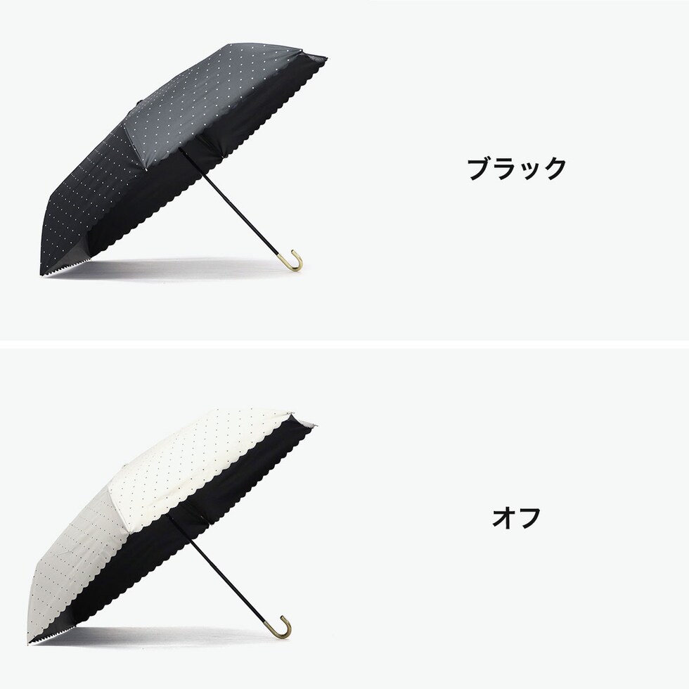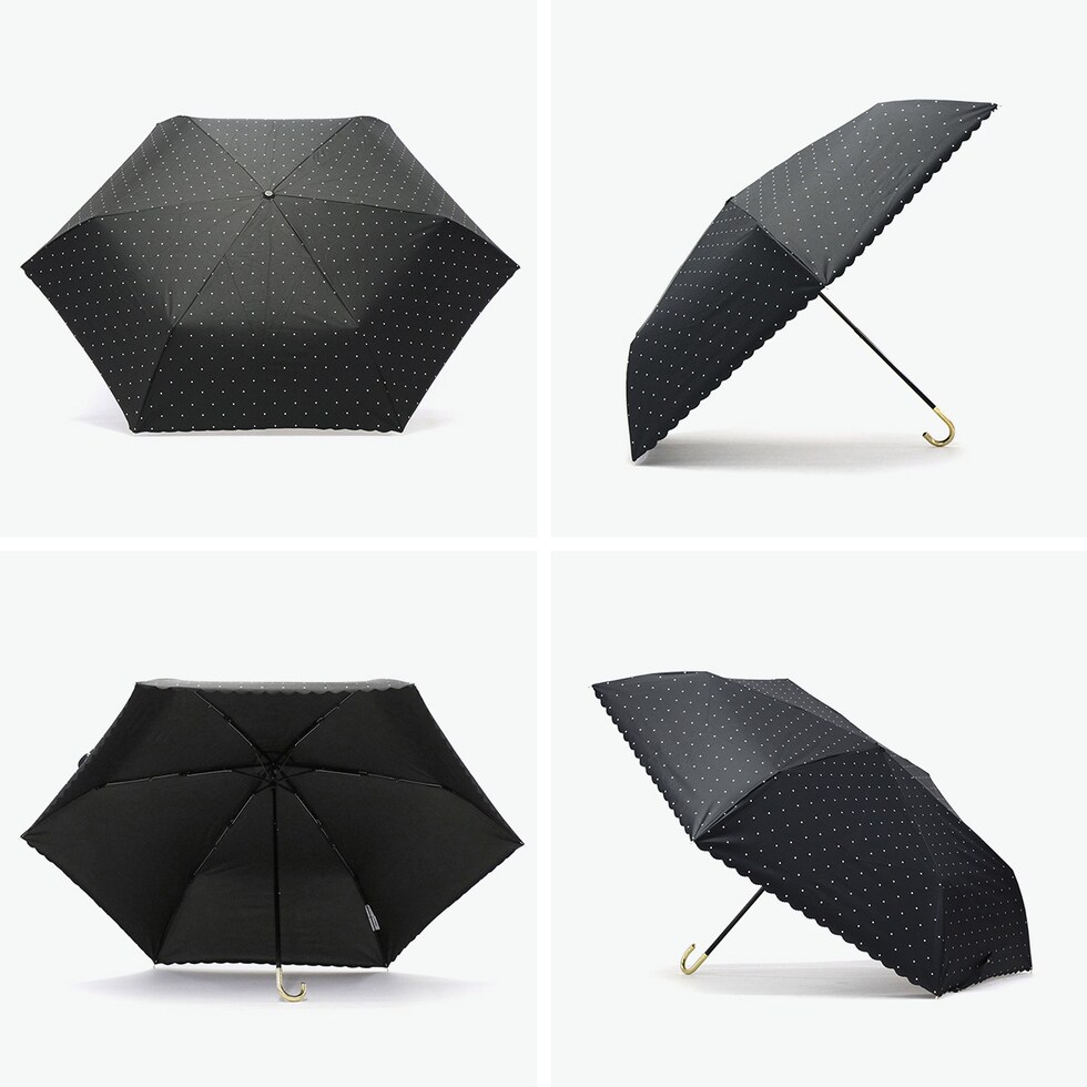 目を惹くドット柄 大きめサイズで紫外線をしっかりガードしてくれるドット柄がかわいい折り畳み日傘。スカラップのフチがガーリーなデザインで、ゴールドのフラワーボタンがワンポイントに。曲がり手元で持ちやすく、3段式の骨を採用した使い勝手の良いアイテムとなっています。 |