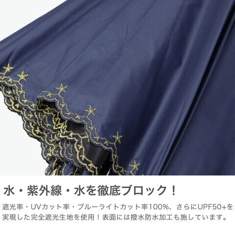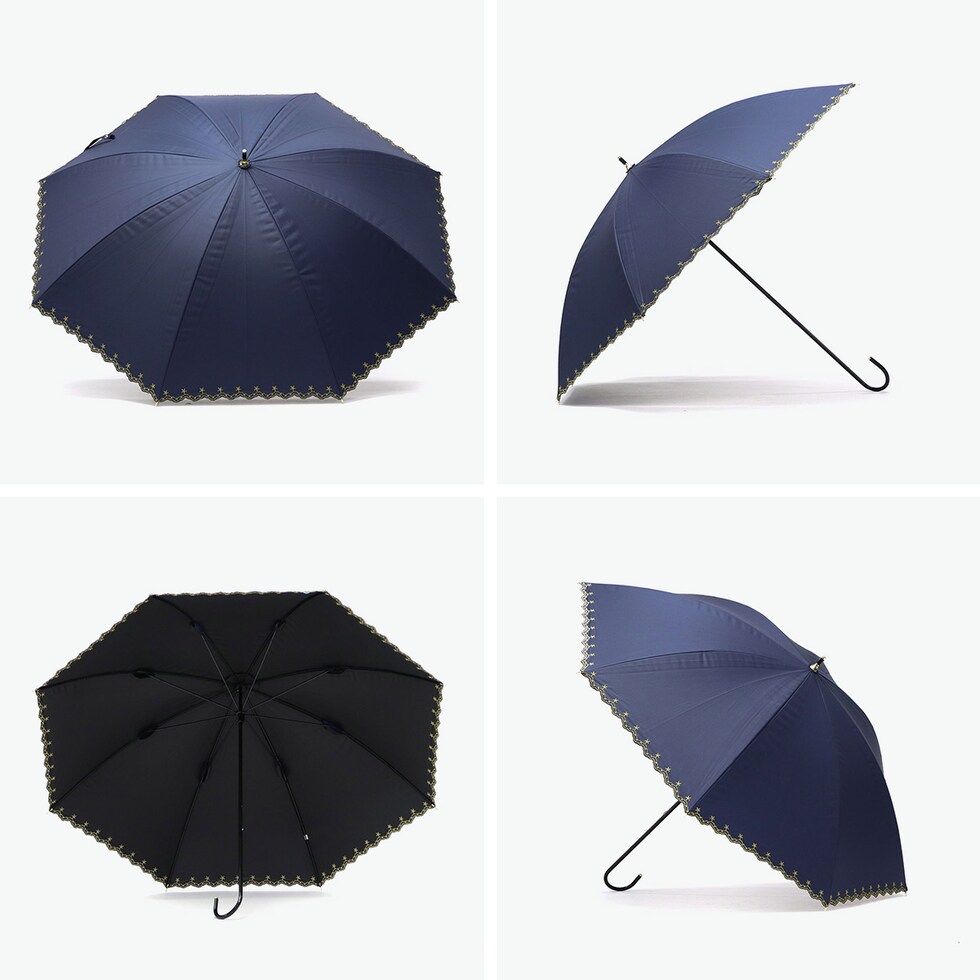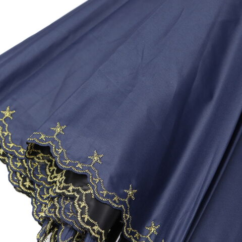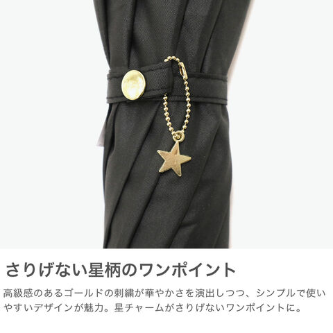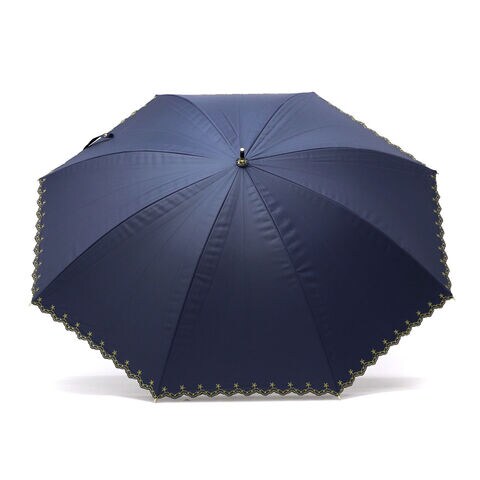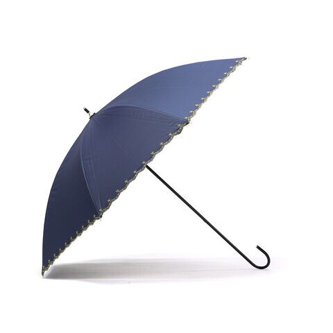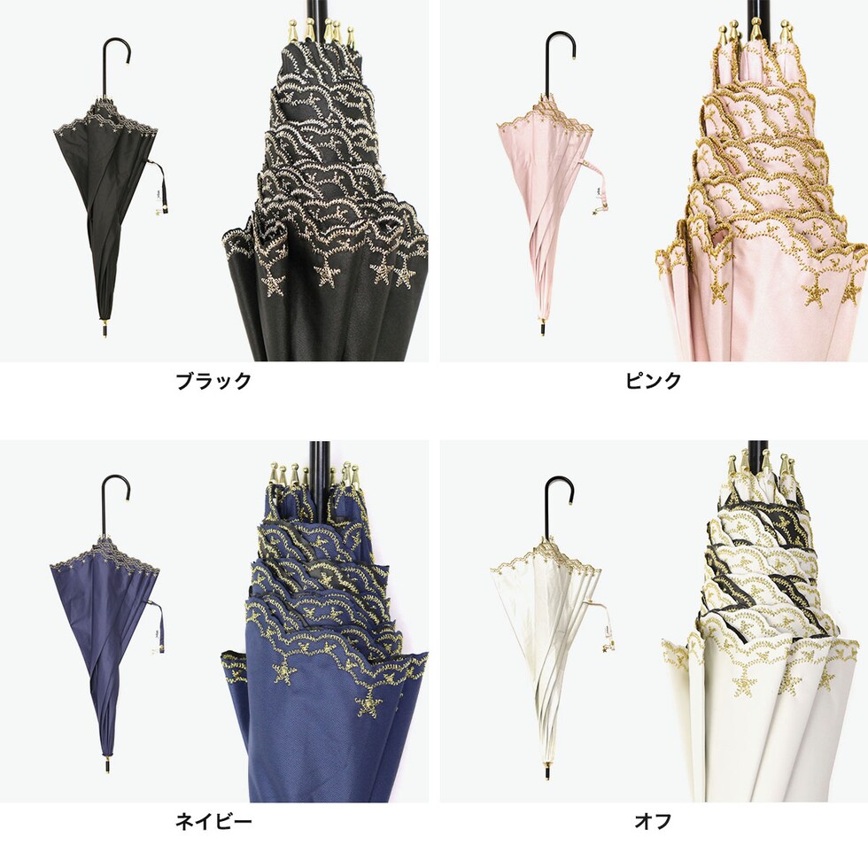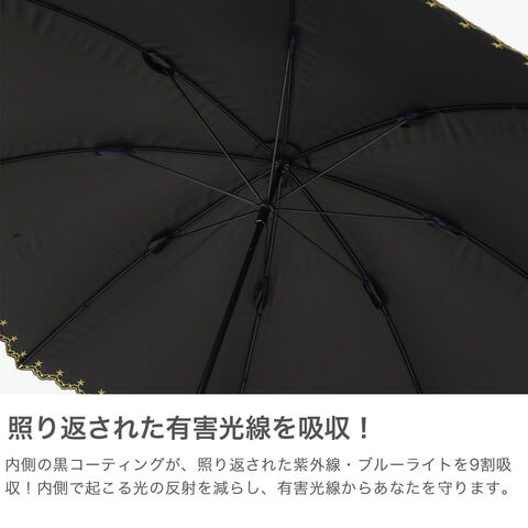 上品でかわいいデザイン 星柄とスカラップに星の刺繍をあしらった上品な日傘。スカラップがやわらかい印象を与え、さりげない星がワンポイントになっています。高級感のある刺繍が華やかさを演出。シンプルで使いやすいデザインながらも機能性面でも安心のアイテムです。 |