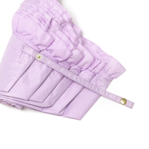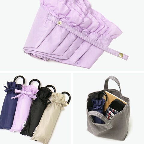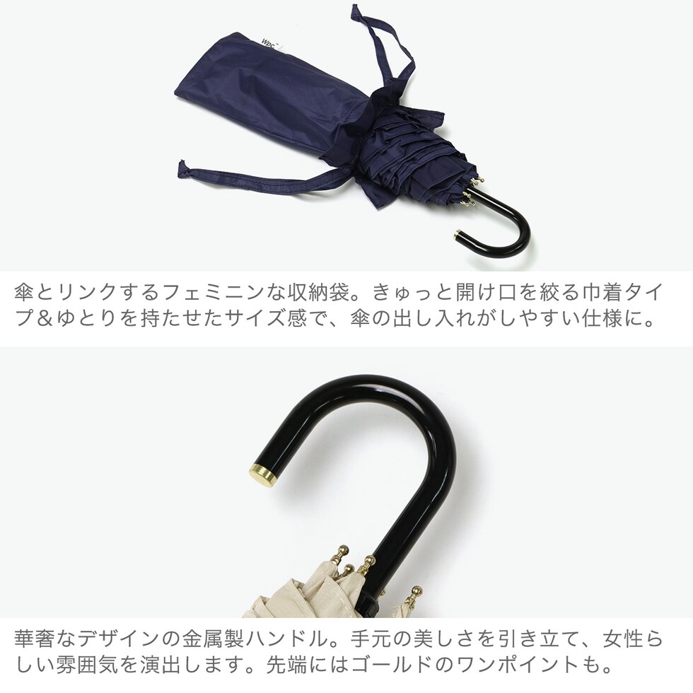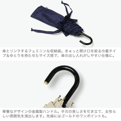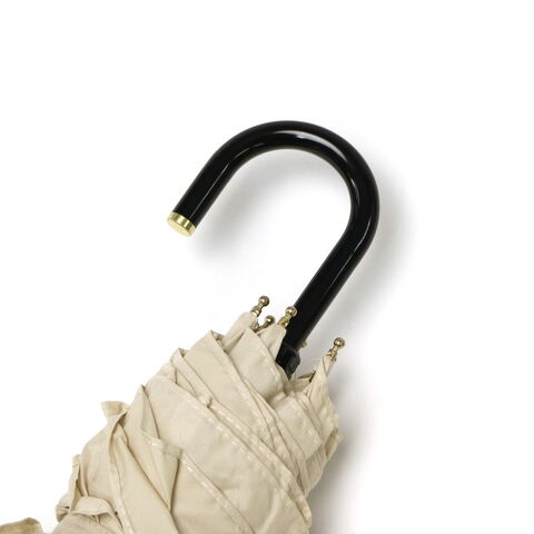 ギャザーを寄せすぎない、上品なフリルがかわいらしい折りたたみ日傘。華奢でレトロな持ち手がよりフェミニンな雰囲気に。ケースにはリボンもあしらい、カバンにいれておくだけでお出かけが楽しくなるアイテムです。万全の紫外線対策ができ、雨の日も安心の晴雨兼用仕様で、様々なシーンでお使いいただけます。