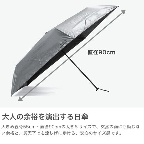 「大人の男性でも自然と日傘が使えるように」と考え、生み出された晴雨兼用傘『IZA/イーザ』。こちらはIZA史上最も軽量でスリムなフォルムの折り畳み傘です。コンパクトながら、開いた時の直径は約90cmと男性でもしっかりカバーしてくれるサイズ感を実現。UVカット率100%、遮光率100%で遮熱効果があり、暑い日の熱中症対策や突然の豪雨にも対応します。