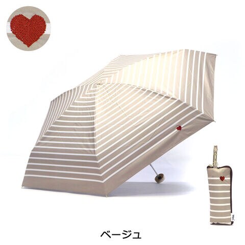 オシャレで持ち運び簡単! 晴雨兼用折りたたみ傘 ボーダーと組み合わせたハート刺繍がワンポイントの晴雨兼用折りたたみ傘。本体は、日々の携帯にもかさばらず持ち歩きに便利なコンパクトサイズ。収納袋にはフックがついているため、バッグの取っ手などに引っ掛けることができ、使用後の傘をバッグの中に入れたくない方にもオススメです。 |