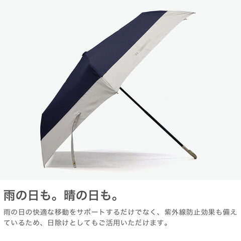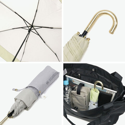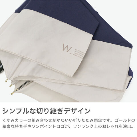 | 晴雨兼用で毎日使える 人気の切り継ぎデザイン シンプルな切り継ぎデザインが可愛い折りたたみ雨傘。絶妙なくすみカラーの組み合わせ、ゴールドの華奢な持ち手や「W.」のワンポイントロゴがワンランク上のおしゃれを演出してくれます。また、紫外線防止効果を備えた晴雨兼用で毎日使える生活の必需品です。 |