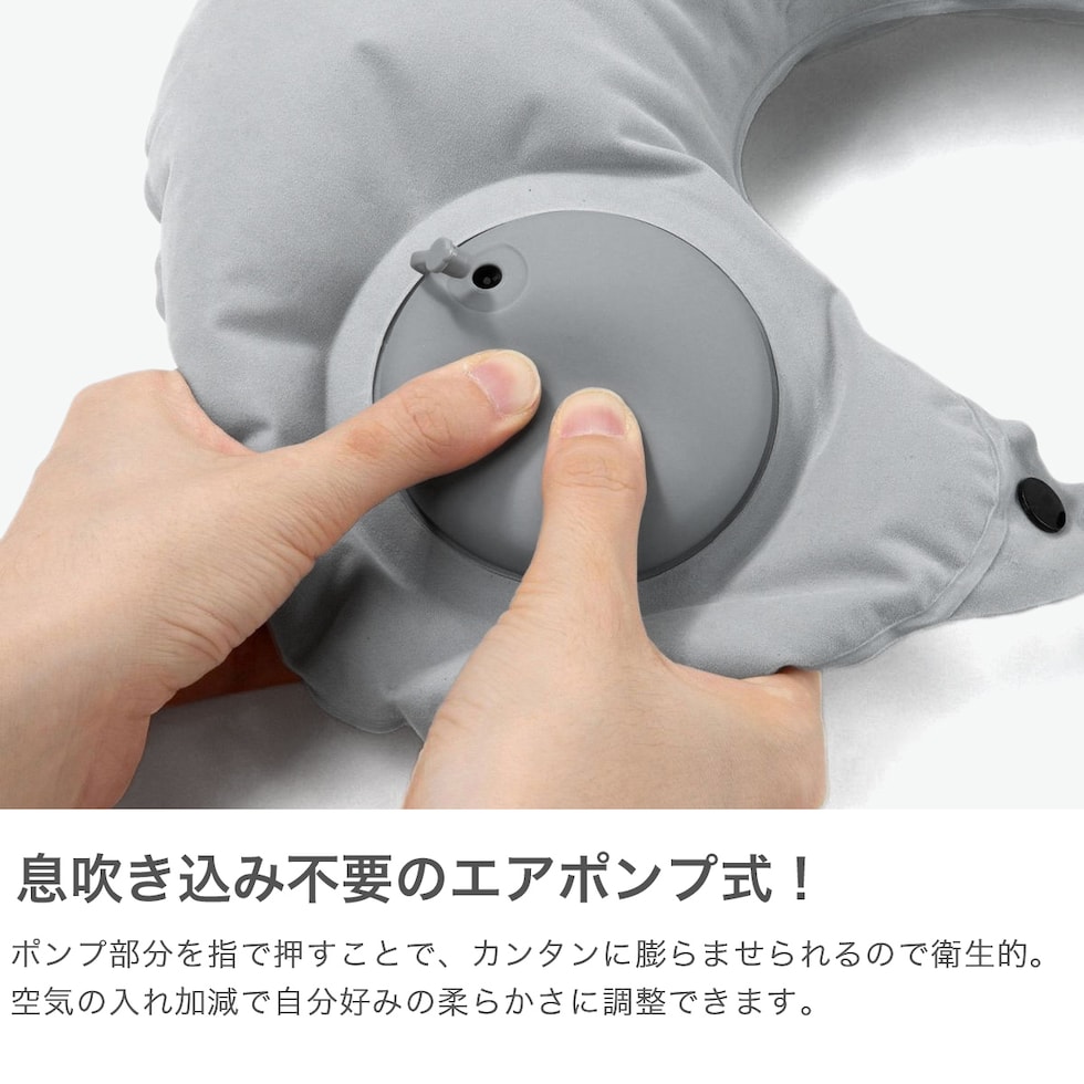 ポンプ式ネックピロー 息を吹き込まず、ポンプを押して簡単に空気を注入でき、また洗濯可能なカバー付きで清潔感をキープ。使用後の片付けも簡単で小さく折り畳んで持ち運べるので、旅行や出張時の長距離移動に重宝します。首をしっかりホールドできるので、機内や車内で隣の席を気にすることなく快適な休息時間を確保できます。 |