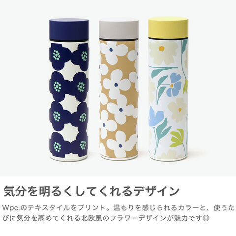 気分も華やぐマグボトル 日常使いしやすい内容量450ml・保温保冷機能付きのステンレスボトル。使うたびに気分を高めてくれる、Wpc.のテキスタイルで、豊富な柄展開からお気に入りを選ぶ楽しさも魅力です。自分用へも、大切な方へのギフトにもピッタリのアイテムです。 |