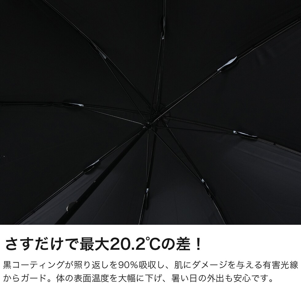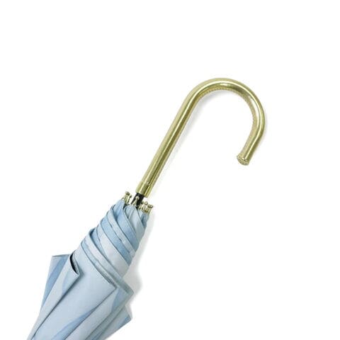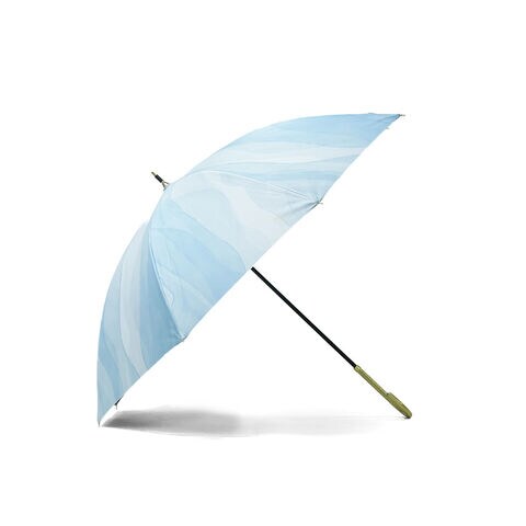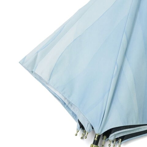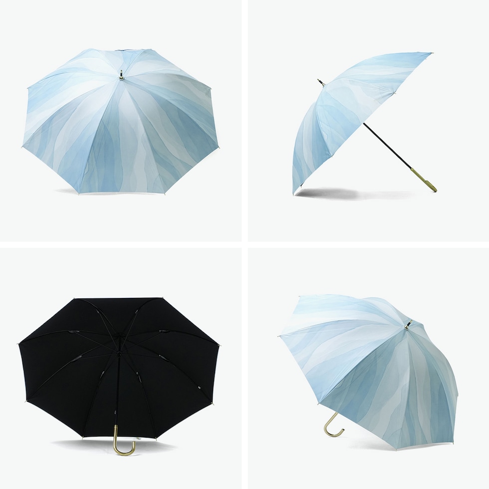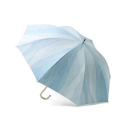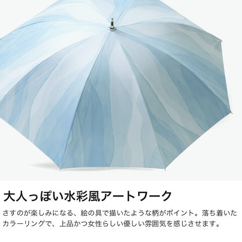 透明感あふれるアート柄 水彩絵の具で描いたような柄が魅力の日傘。はっ水防水加工を施しているため雨傘としても使用できます。傘内側の黒コーティングが照り返しを90%吸収し、傘の内側で起こる光の反射を大幅に減らして、肌にダメージを与える有害光線からガードします。水彩風の美しさを落ち着いた色合いで表現し、大人っぽい雰囲気に仕上げました。ゴールドのロゴシルクプリントと、ゴールド合皮手元が、上品な輝きを添える品格ある1本です。 |