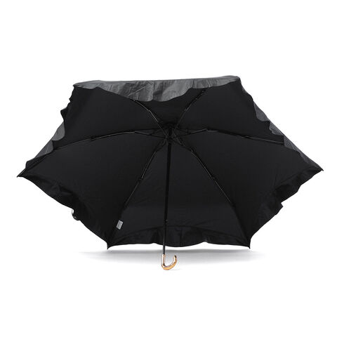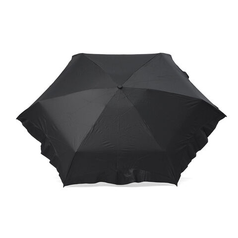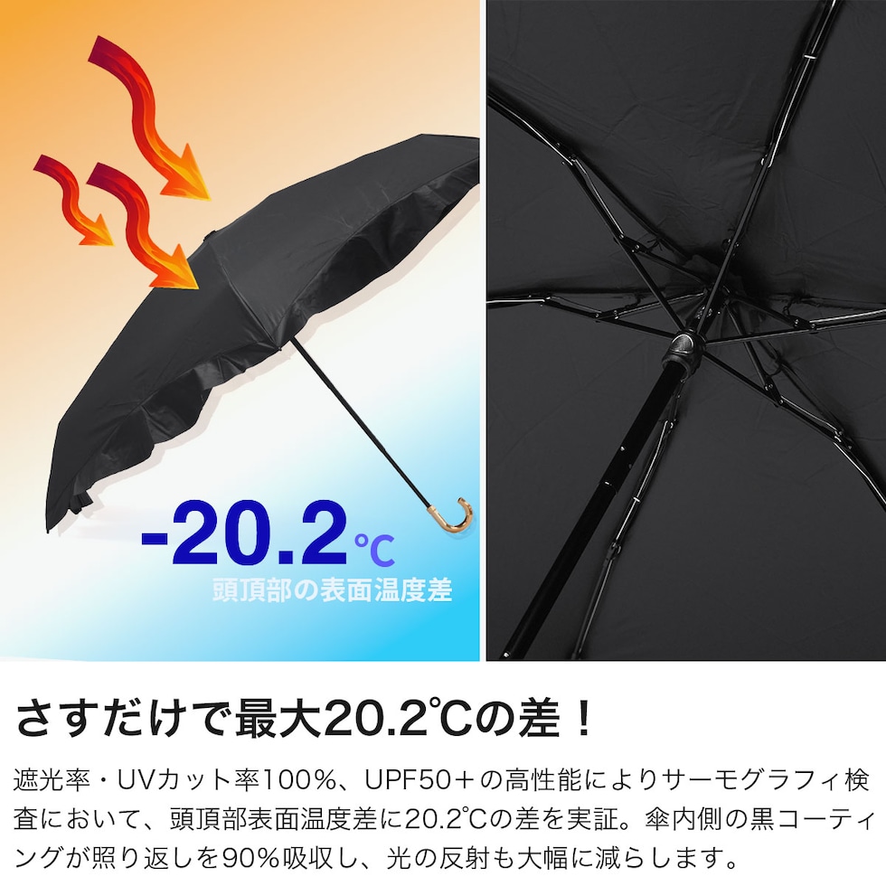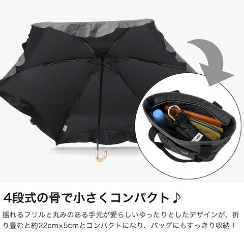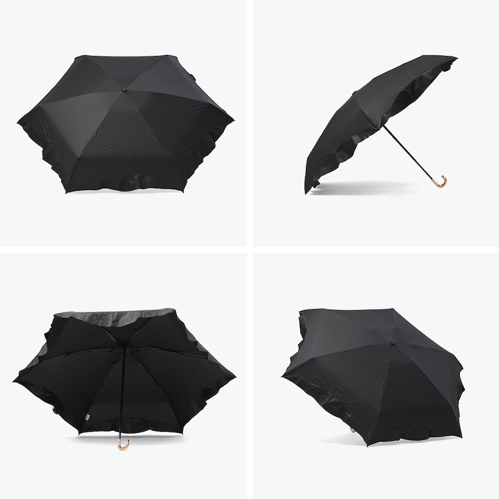 大人カワイイ日傘♪ 控えめなフリルとゴールドの手元が上品な可愛らしさを添える折りたたみ傘。4段骨構造によりコンパクトにまとまり、小さなバッグにもすっきり収まります。遮光率・UVカット率ともに100%、UPF50+の高機能仕様に加え、内側の黒コーティングが照り返しを約90%吸収。紫外線などの有害光線から肌を守ります。さらに撥水加工を施し、雨の日にも対応。季節を問わず活躍する一本です。 |