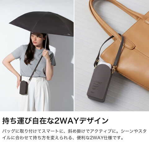 | 身軽に持てる 新感覚日傘 ポシェットのように肩掛けできる、新しい持ち運びスタイルの折りたたみ日傘。コンパクトなタイニーサイズで持ち歩きやすく、必要なときにすぐ取り出せます。2WAY仕様でバッグ装着も可能。遮光率・UVカット率100%、UPF50+の高機能で紫外線対策も万全。マットな質感のケースとくすみカラーが、大人のスタイルに自然に馴染みます。 |