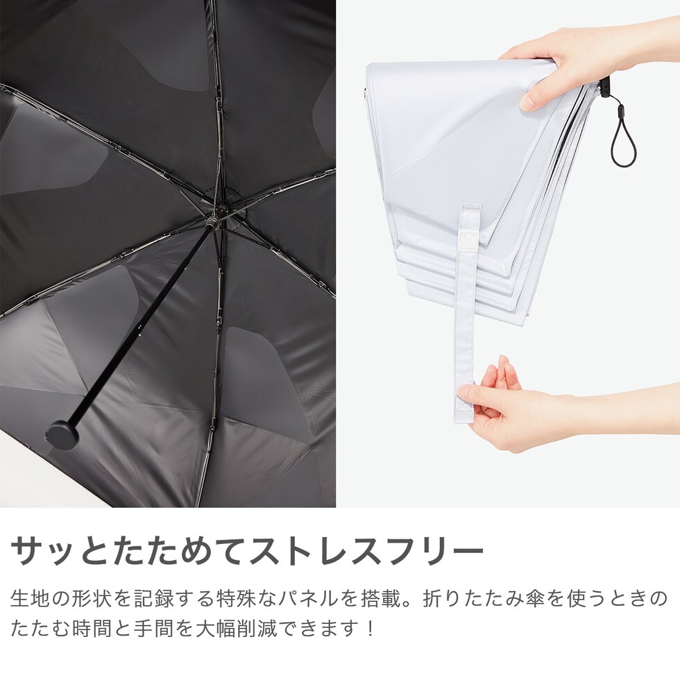 クイックに畳める折傘 大人気クイックシャットに日傘機能搭搭載した折りたたみ傘が登場。生地の裏にパネルを付けて畳みやすくしているので、時間と手間を大幅削減してくれます。重さも約210gとバッグの中に入れて持ち運びしやすい軽量設計。UVカット率・UVカット率共に100%で、遮熱効果も高いので、紫外線対策に効果的なアイテムです。 |