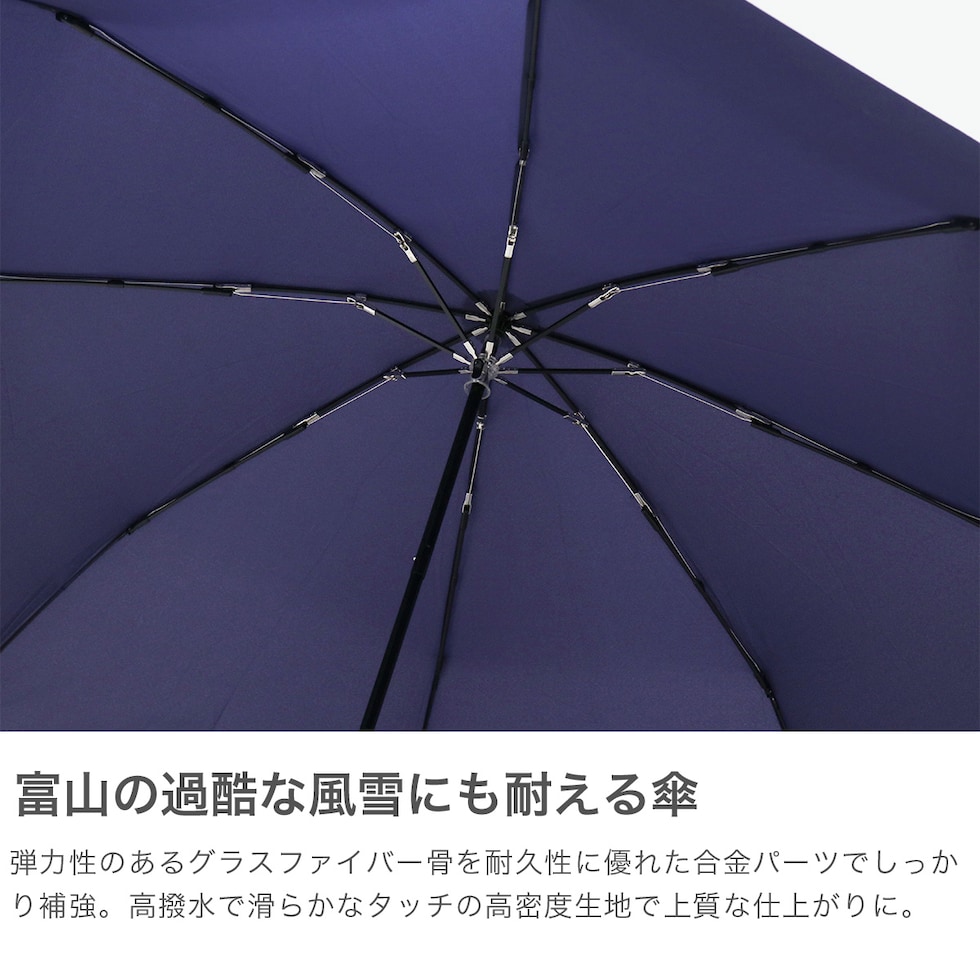 富山の過酷な風雪にも耐える傘として誕生した『富山サンダー』の折りたたみ傘です。弾力性のあるグラスファイバー骨を合金パーツでとめて耐風性に富んでます。高い撥水性能はもちろんのこと、晴れの日でも使える紫外線カット加工付で機能的なアイテムとなっています。