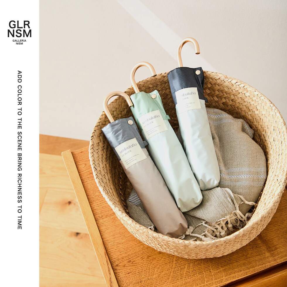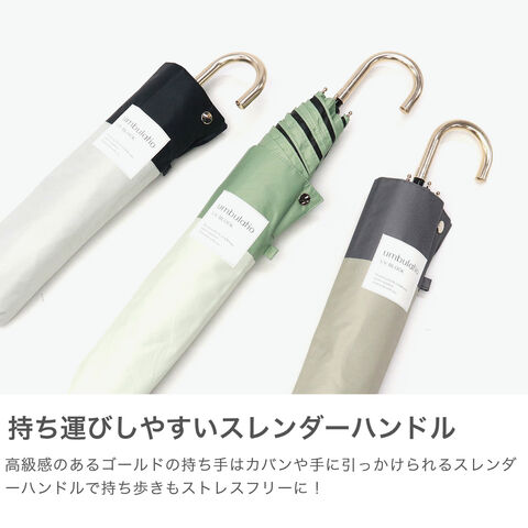 毎日にフィットする 雨の日も、晴れの日も日々の暮らしの中で、頼れるアイテムを揃えた『umbulatio』の「スレンダーハンドルUVブロック」。手にかけられるハンドルで持ち運びに便利なデザイン。UVCUTと遮光率が99.9%以上の遮熱効果も高い生地で、日傘としてはもちろん、高い撥水性と耐水圧で雨の日でも使用いただけます。ベーシックでありながら使いやすい折りたたみ傘となっています。 |