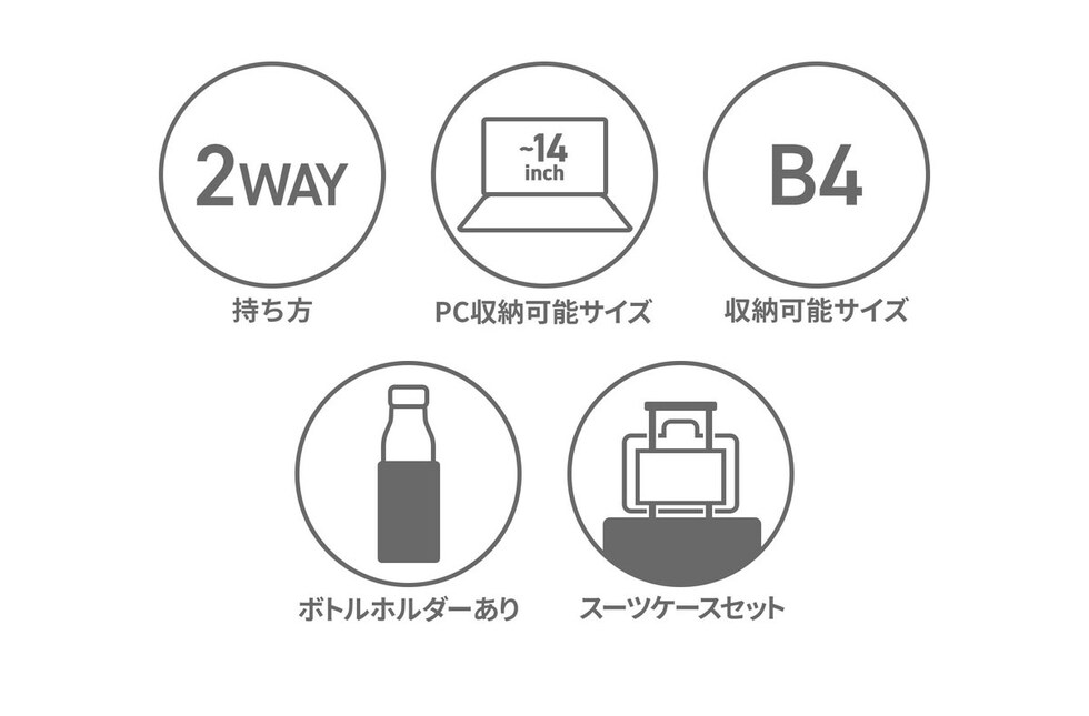 | 仕様 | <外側> ベルクロポケット(L)×1 ジップポケット(L)×1 └ 内蔵 ポケット(S)×1 ポケット(XS)×1 ジップポケット(M)×1 <内側> PC収納×1 ジップポケット(L)×1 ボトルホルダー×1 <付属品> ショルダーストラップ×1 |