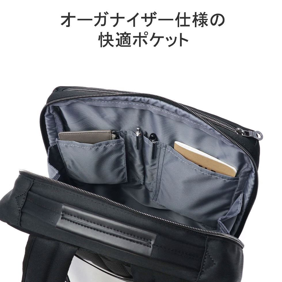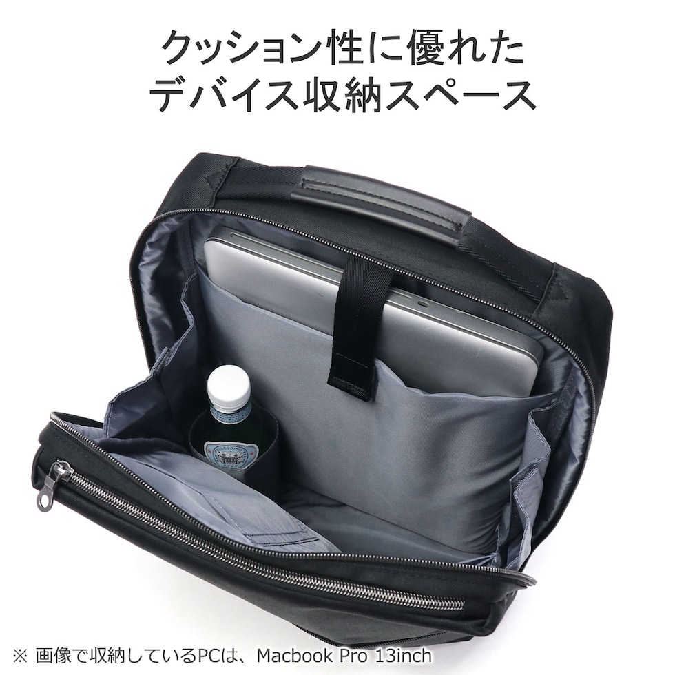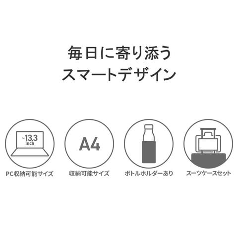 | 仕様 | <外側> ジップポケット(L)×1 └ 内蔵 ポケット(S)×1 ジップポケット(M)×1 <内側> PC収納×1 ポケット(XS)×2 ペンホルダー×1 ボトルホルダー×1 |