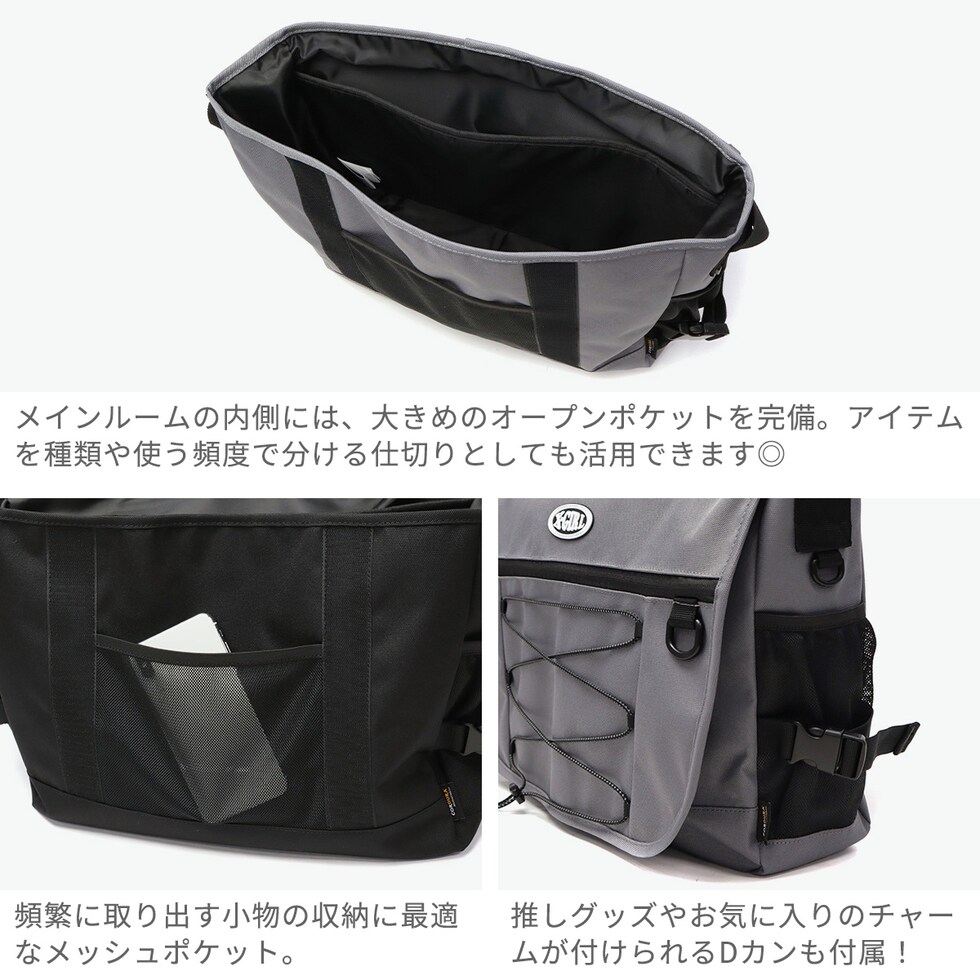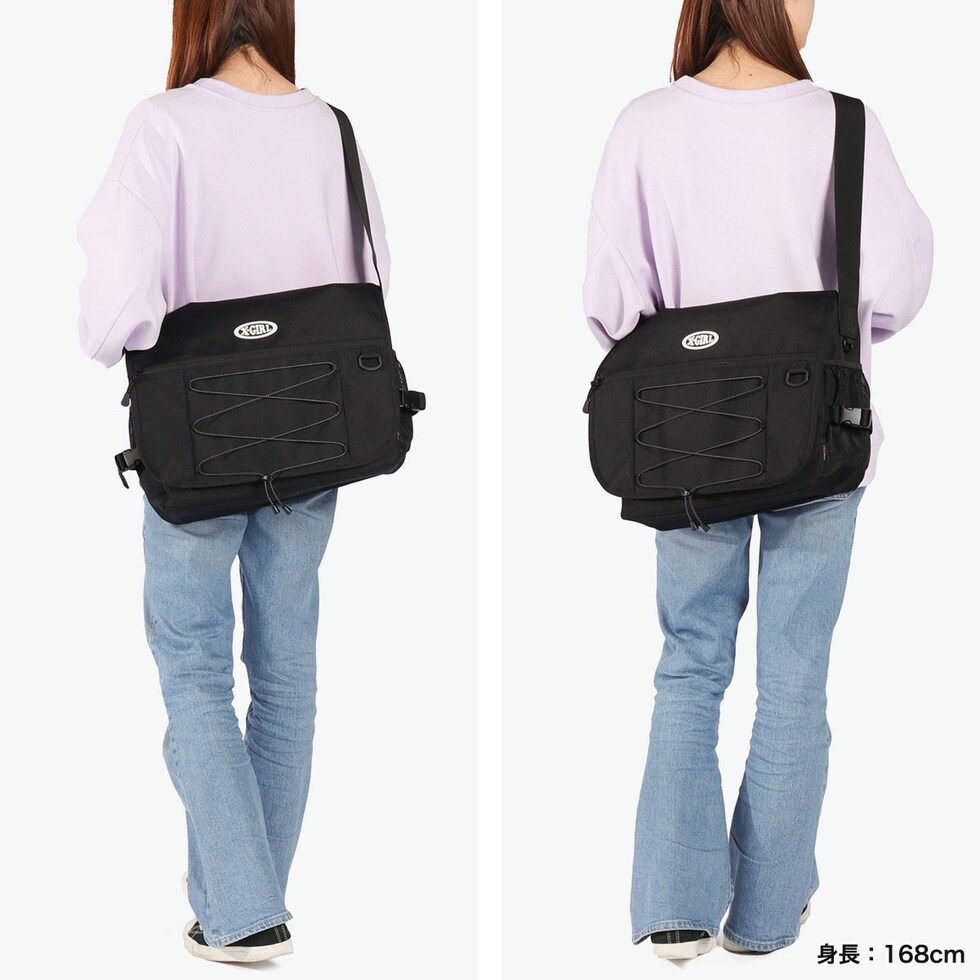 | バンジーコードが映える メッセンジャーバッグ シティユースから通勤通学、旅行やイベントまで幅広く活躍するメッセンジャーバッグ。A4サイズが収まる実用的なサイズ感で、収納力はもちろん、フロントのバンジーコードとX-girlのロゴがアクセントになった、ポップで目を引くデザインが魅力です。 |