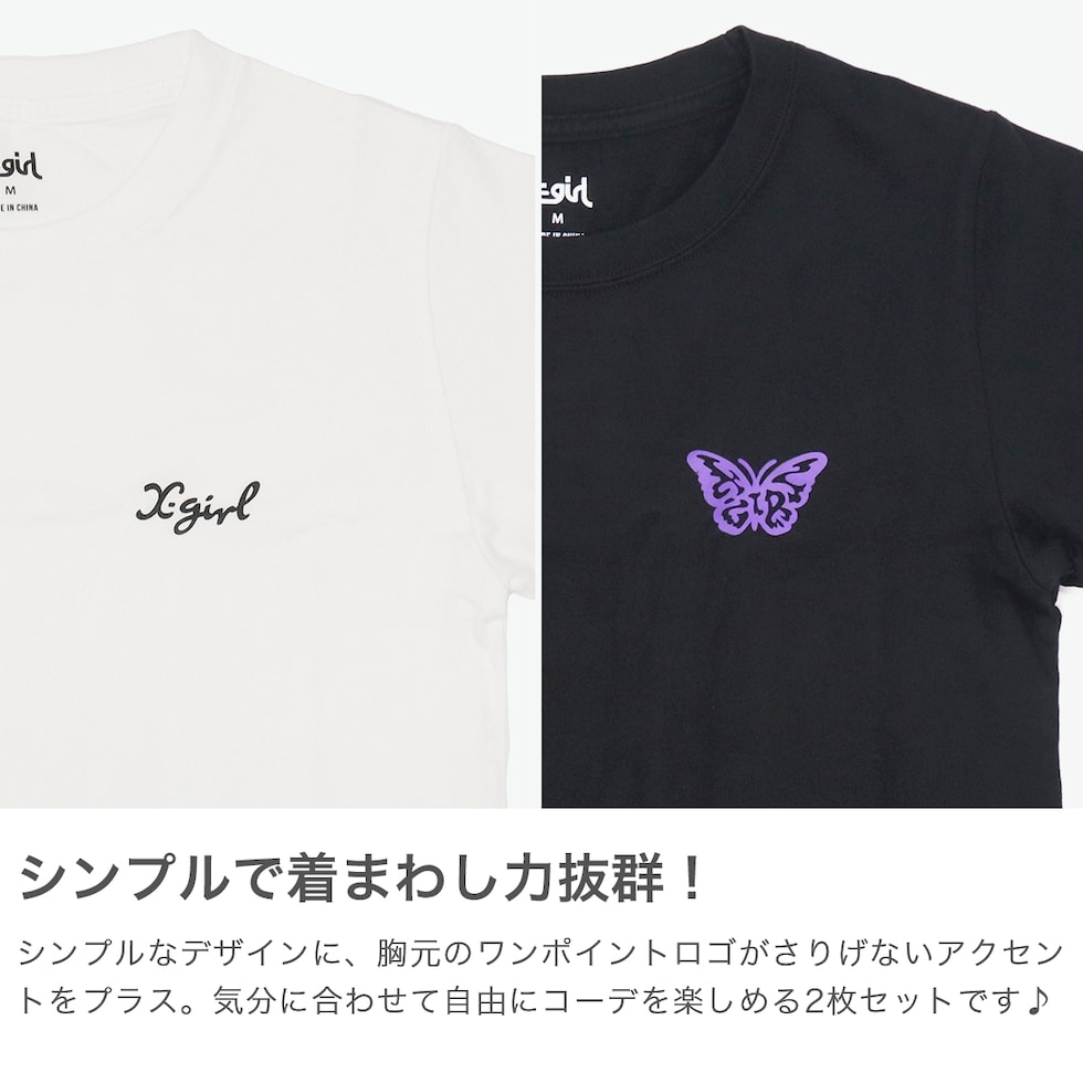 エックスガール Tシャツ レディース X-girl 半袖 綿100% 無地 ロゴ ブランド おしゃれ かわいい カジュアル クルーネック 2枚セット 白 黒 コンパクト トップス カットソー LOGO AND BUTTERFLY 2P S/S BABY TEE 105252011032