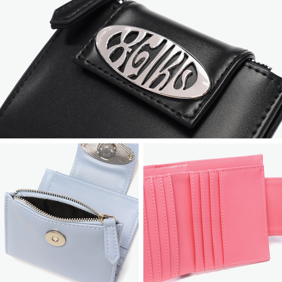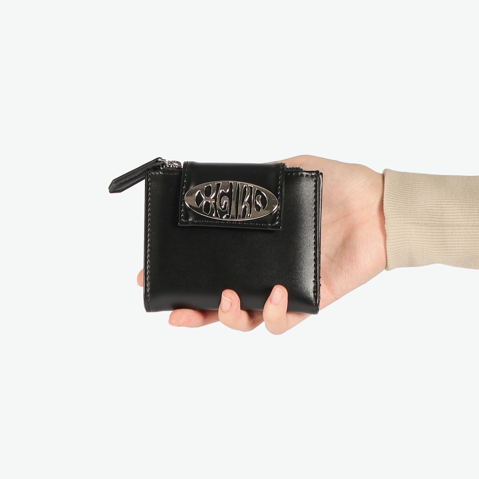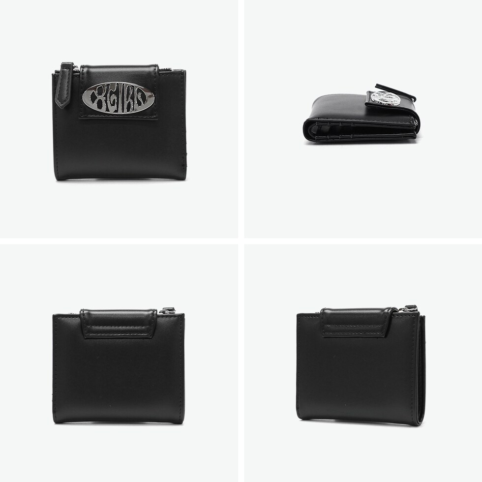 スマートな二つ折り財布 スリムな財布をお探しの方におすすめのミニ財布。持ち運びに便利な薄型二つ折り仕様で、ジップ付きのコインケースやお札ポケット、カードポケットなど収納力も充実しています。フェイクレザーに映えるメタリックなロゴバックルがアクセントになり、デザイン性と機能性を兼ね備えたアイテムです。 |