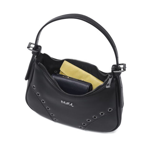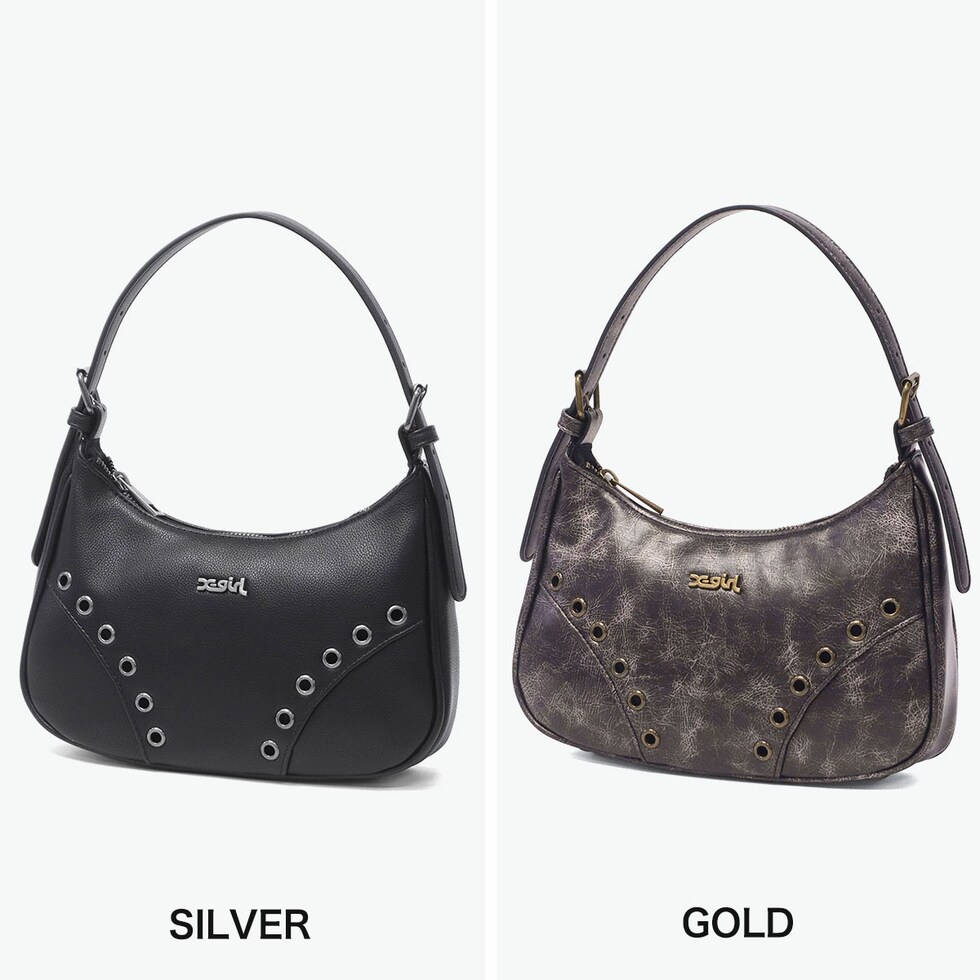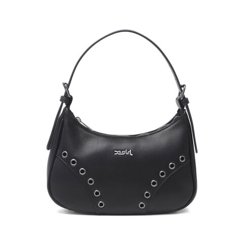 ハトメディテールが魅力 デイリー使いしやすいトレンドライクなハンドバッグです。フェイクレザーの柔らかい生地感と開きやすい開口部の作りで、荷物の取り出しもスムーズ。フロントにあしらわれたハトメがほどよいアクセントになっており、キレイめスタイルにもストリートコーデにも相性抜群のデザインです。 |