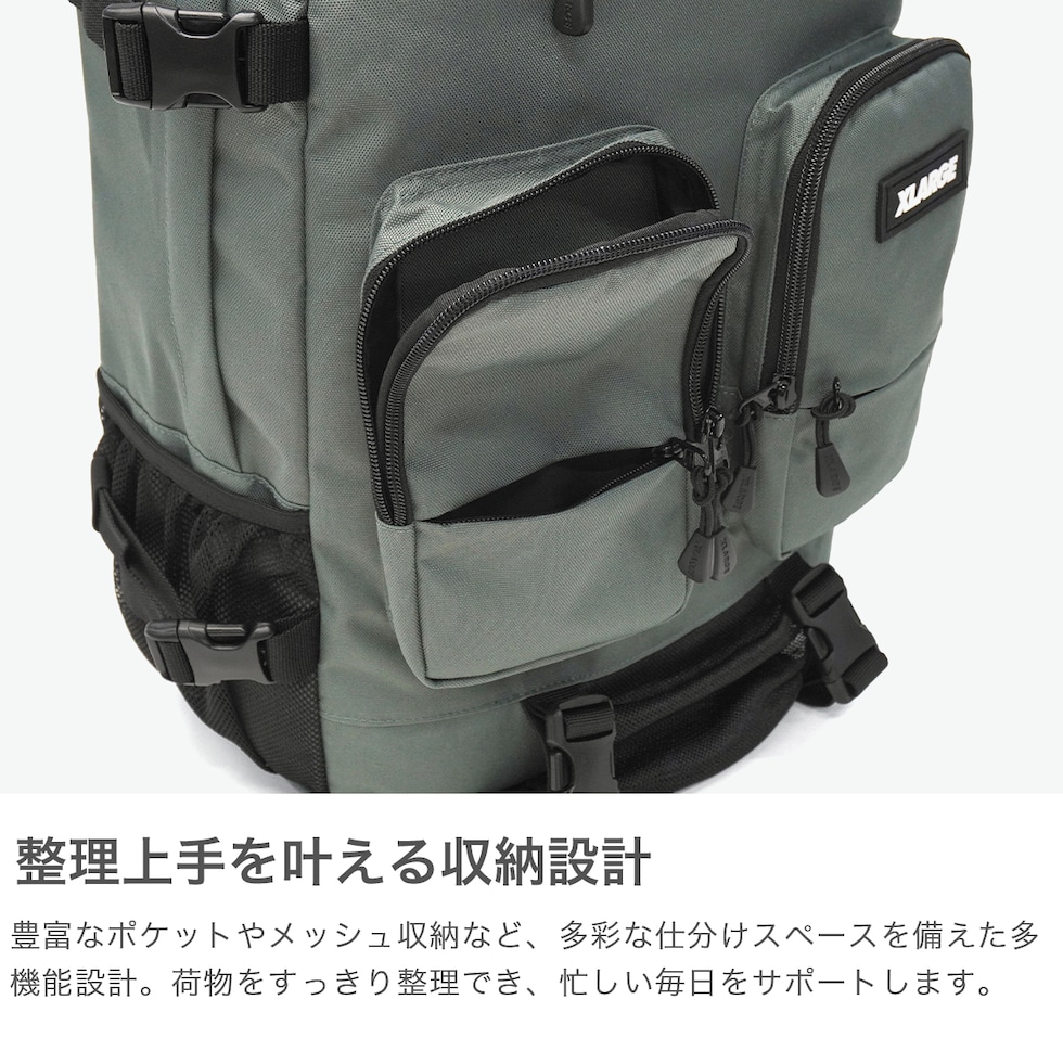 『XLARGE』の存在感 フロントのポケットが特徴的な多機能バックパック。ロゴのラバータッチもさりげないポイントになっており、多数のポケットやメッシュ収納などを備えた使いやすいつくり。通勤・通学などユニセックスで持てる、シンプルながらも『XLARGE』らしい仕上がりとなっています。 |