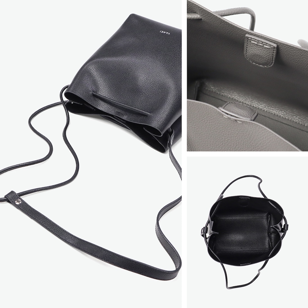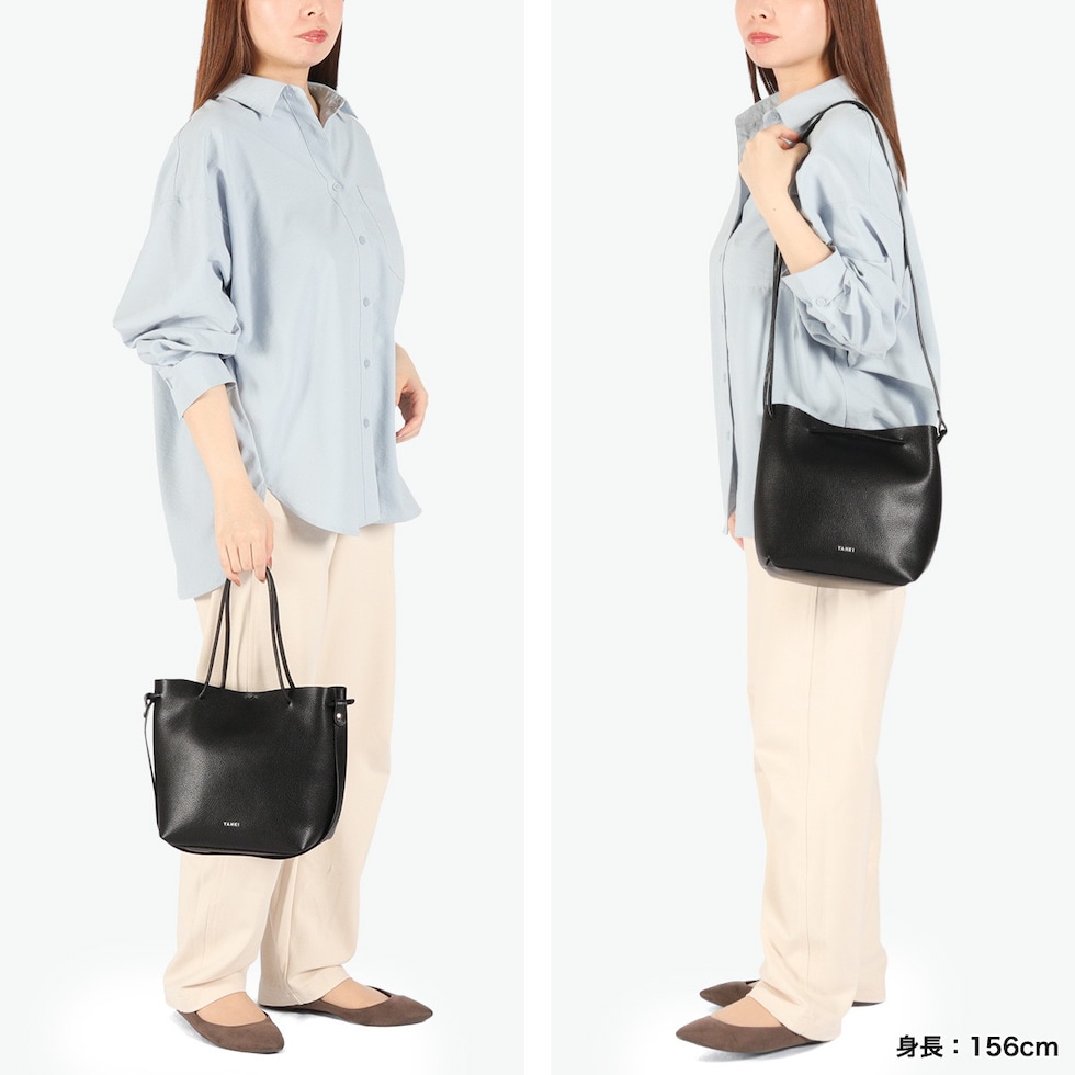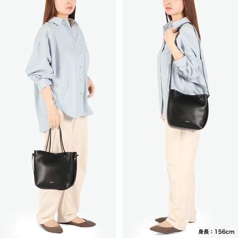 | シンプル×機能美 絶妙なバランス感 ソフトシュリンクレザーを使用した、シンプルで上品でなバッグ。ミニマルな本体に丸紐ハンドルとベルトディテールを効かせた機能美あふれるデザインです。ベルト端を引くだけでハンドルが斜めがけ可能なストラップに変わる2WAY仕様。コンパクトながらも収納力があり、実用性と上品なカジュアル感兼ね備えた洗練アイテムです。 |