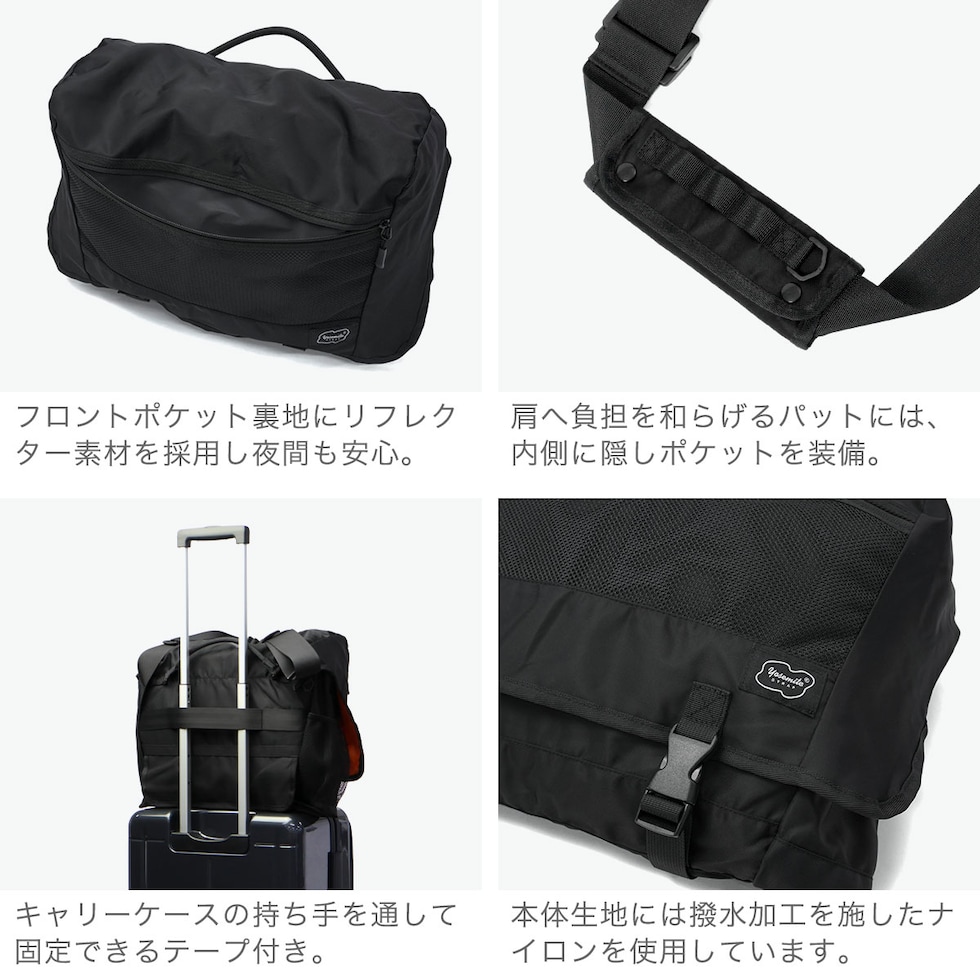 | 広がる収納力 機能派メッセンジャー YOSEMITE STRAPから、容量拡張が可能な高機能メッセンジャーバッグが登場。撥水ナイロン素材を採用し、通勤や旅行、アウトドアまで幅広く対応します。PC対応クッションポケットを備え、視認性と利便性を向上。日本製ナイロンロープの持ち手やキャリーオン機能も搭載し、日常からトラベルまで快適に活躍します。 |