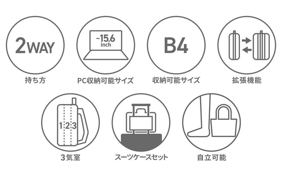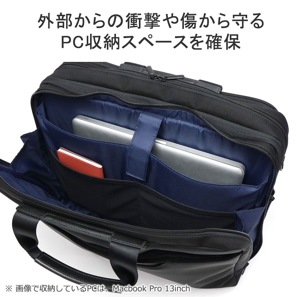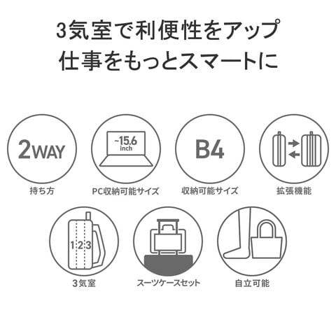 | 仕様 | <外側> ジップポケット(L)×1 <前面収納> ポケット(S)×2 ペンホルダー×2 <中央収納> ジップポケット(L)×1 メッシュポケット(M)×2 メッシュポケット(S)×3 <背面収納> PC収納×1 メッシュポケット(M)×2 <付属品> ショルダーストラップ×1 |