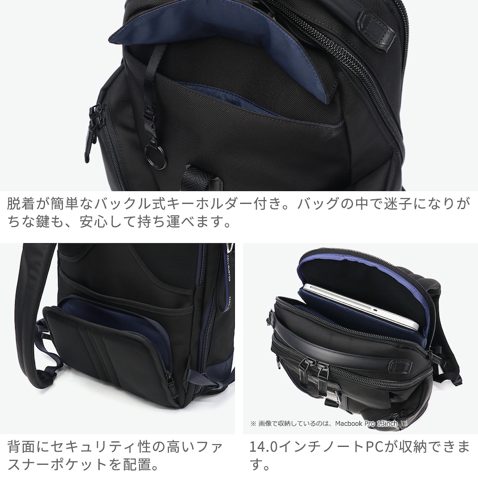 | 仕様 | <外側> ポケット×4 <内側> ポケット×6 PC収納×1 ペンホルダー×2 キーリング×1 <付属品> キーホルダー×1 |