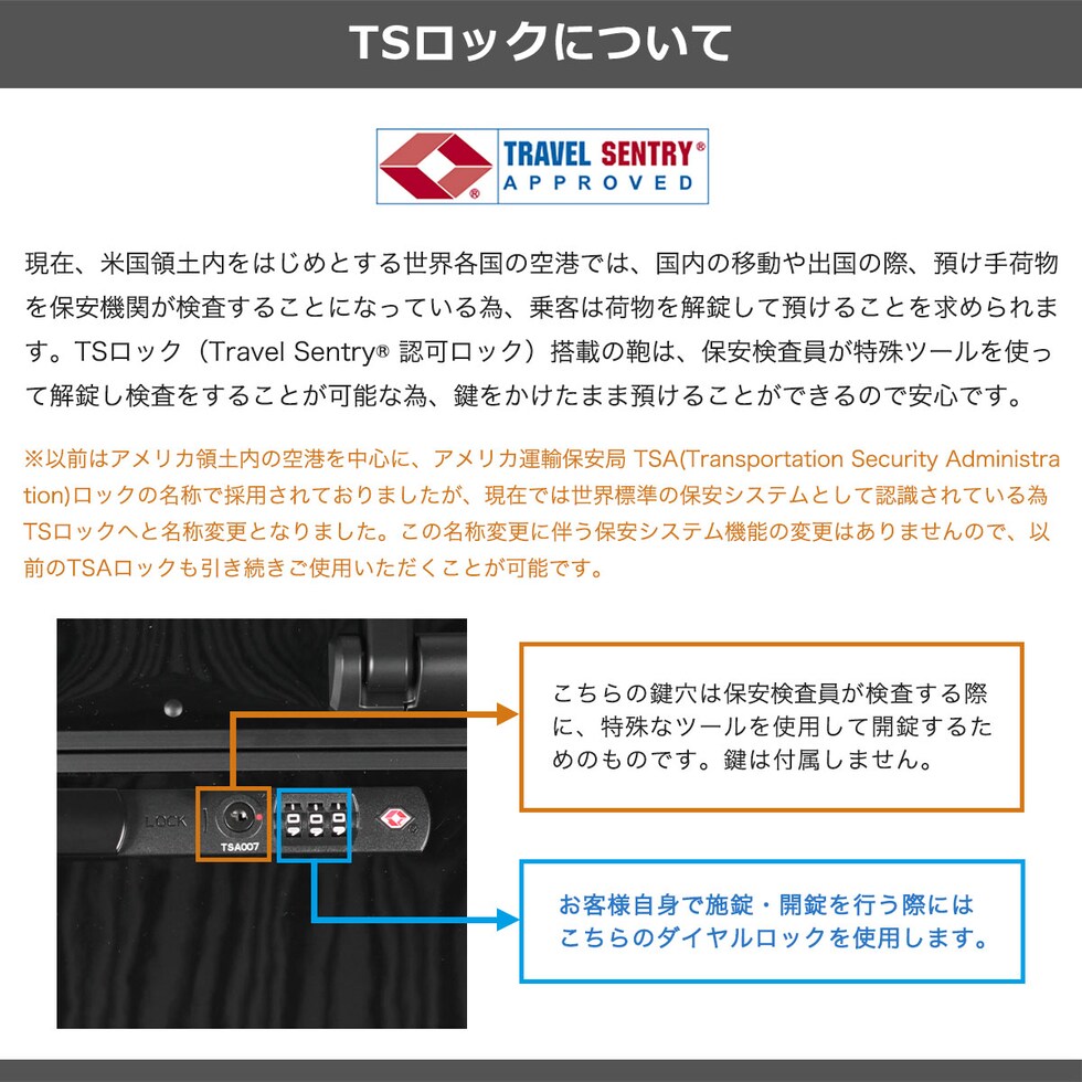 大人のトラベルギア 72Lの容量を備えた、長期旅行や海外出張に対応するチェックインサイズのスーツケース。軽量で高耐久なポリカーボネート製ボディに、剛性の高いアルミフレームを採用し、優れた耐衝撃性を実現。回転を補助するベアリング内蔵の静音キャスターにより、重い荷物でもスムーズに運べます。 |