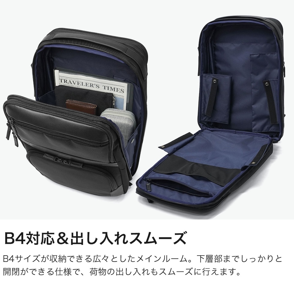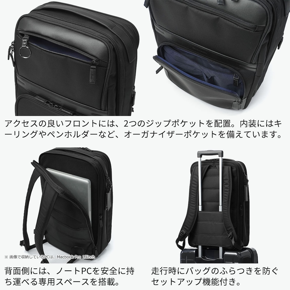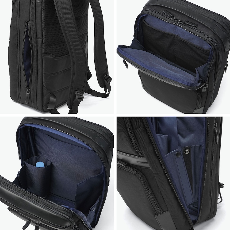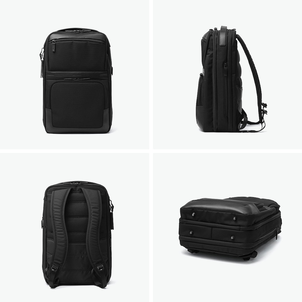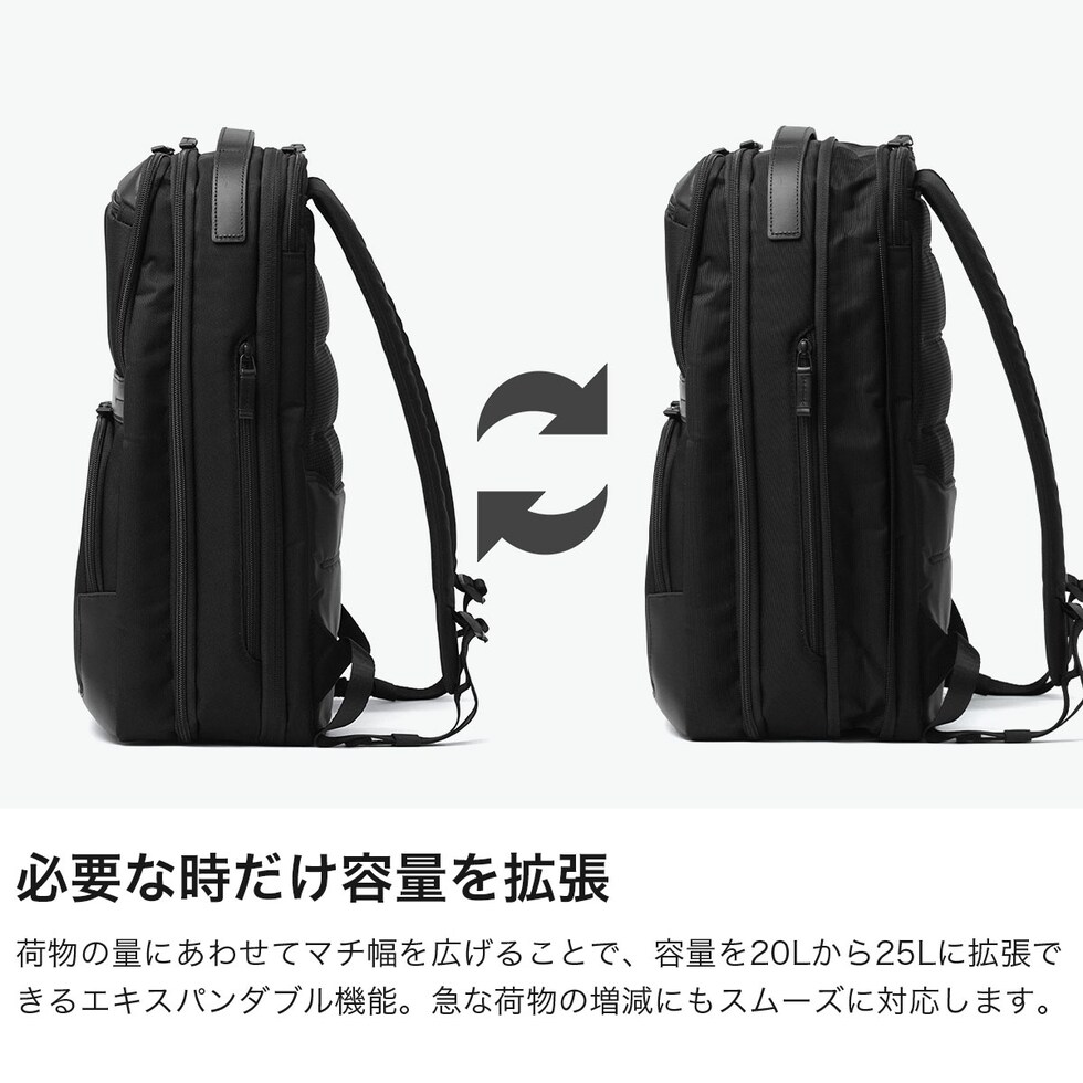 | 働く日常に スマートな余裕を フォーマルな佇まいに快適性と機能美を融合したビジネスバッグコレクション『ZEST3』シリーズ。こちらは、20Lから25Lのエキスパンダブル機能を搭載したビジネスリュックです。15.6インチPC対応の専用スリーブを備えた機能的な設計や、B4書類やデバイスをゆとりをもって収められる収納力に加え、スーツケースへのセットアップ機能も備えています。通勤から出張まで対応する、デザイン性と高い機能性を両立したハイスペックな仕上がりです。 |