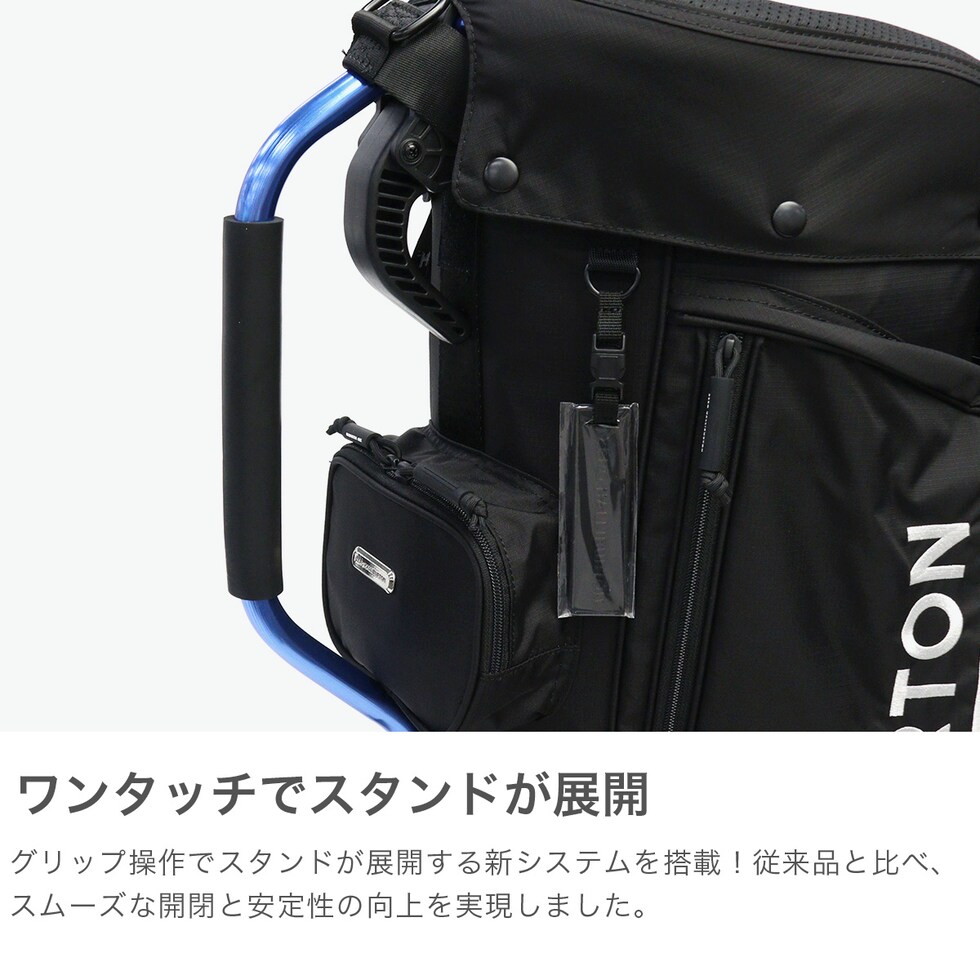 | ワンタッチでスマートに 安定感あるゴルフバッグ 軽量ながら頑丈なアルミフレーム構造で型崩れを防ぎ、より安定した使用感を実現させたスタンド型キャディバッグです。本体の素材は丈夫なコーデュラナイロンを使用し、撥水加工により急な雨でも安心して使えます。3点式ショルダーベルトも付いており、体にフィットするため長時間の移動も疲れにくい設計になっています。 |