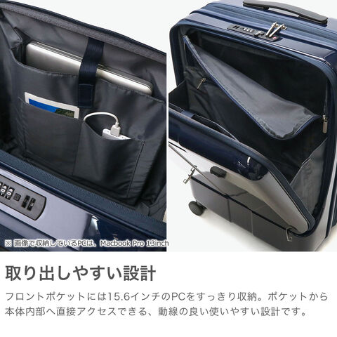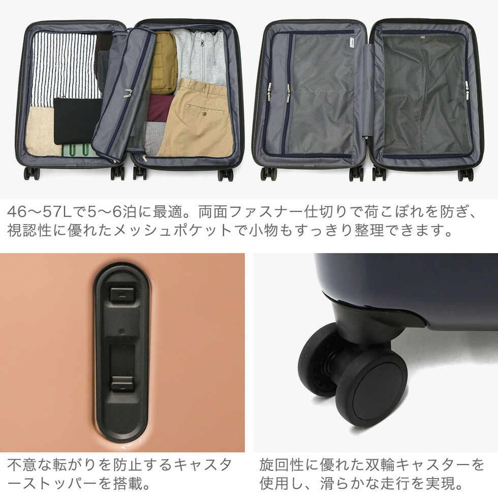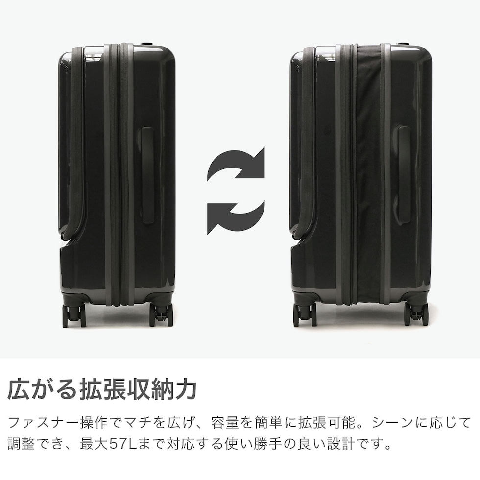 旅行から出張まで活躍 旅行は勿論、出張などにも活躍する洗練されたデザインが魅力のスーツケース。こちらは、46Lから57Lに容量の拡張が可能なエキスパンダブル機能が備わり、5~6泊の旅行に最適なモデルになっています。パッキングから移動中まで使いやすい充実の機能性で、旅を快適にサポートします。 |