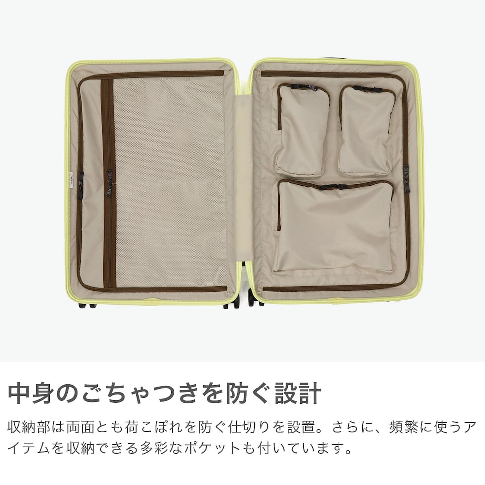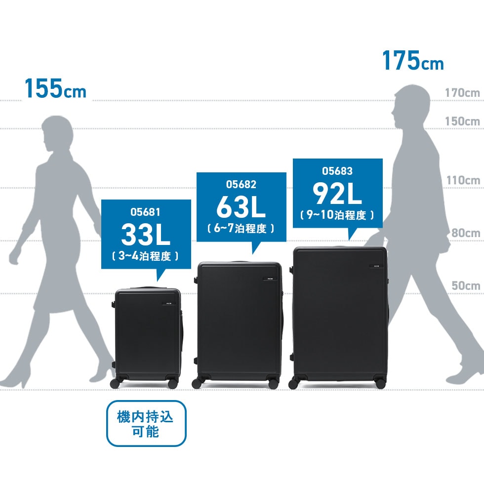 63L容量キャリーケース マットな質感で持つ人を選ばない『ベベル』シリーズの63L容量のスーツケース。国内旅行や短期の旅行に調度いいサイズ感。背面にはドリンクホルダーを完備した機能性に優れたつくりで、ビジネスやカジュアルシーンにマッチします。 |