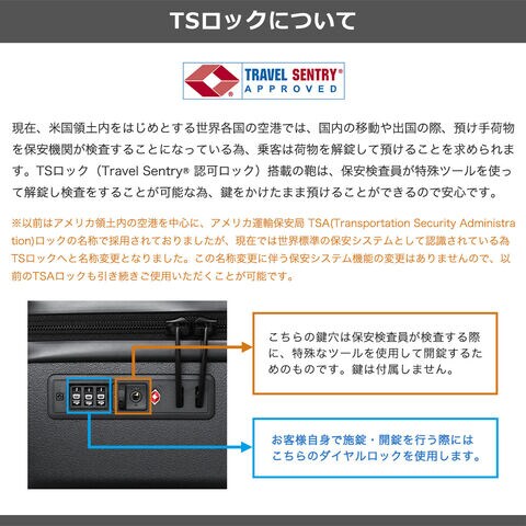 | <購入前にご確認ください> ・メーカーの意向により、付属品の収納袋や箱、製品の仕様やデザインは予告なく変更となる場合がございます。 ・下記による返品・交換はお受けすることができませんので、予めご了承ください。 └ 製品の性質上による細かいキズや塗装ムラ、気泡などがある場合。 └ 配送用の段ボールにキズ、汚れ、破損がある場合。 ・エキスパンダブル機能付きの製品は、マチ拡張時の3辺の和が機内持ち込みサイズ、預け入れ無料サイズを超える場合がございます。また、航空会社や飛行機の機種などによって規定が異なりますので、予めご確認の上お求めください。 ※機内持ち込みサイズ目安表はこちら ・摩擦・水濡れ・日焼けなどにより、色落ち・色褪せが生じる場合があります。 また、製品と衣類の接触により、相互に色移りする場合がございます。 ・柄の位置やカラーバランスなどは、生地の裁断や製造過程、素材の特性により画像とは異なる場合がございます。商品をお選びすることはできませんので、予めご了承ください。 ・極力実物に近い色味を再現しておりますが、モニター等の条件により画面上と実物では色味が異なって見える場合がございます。 |