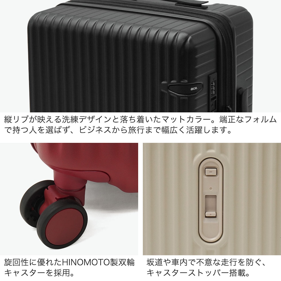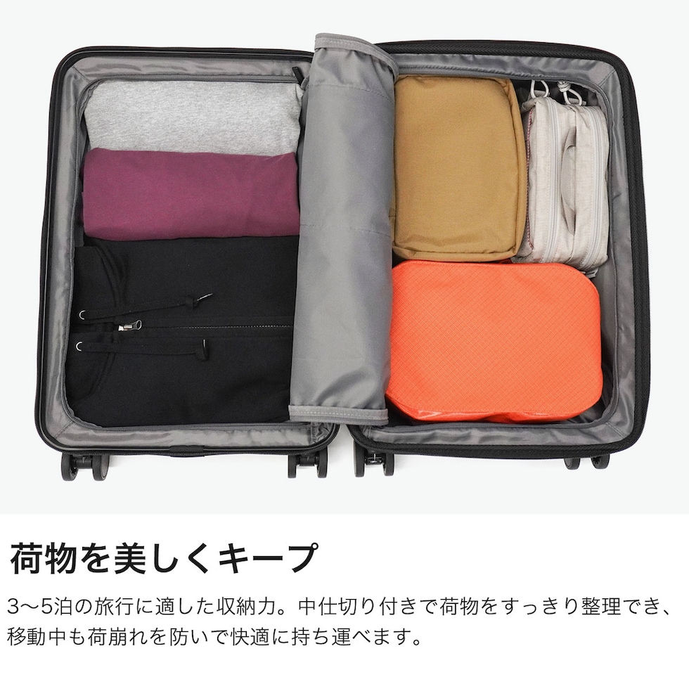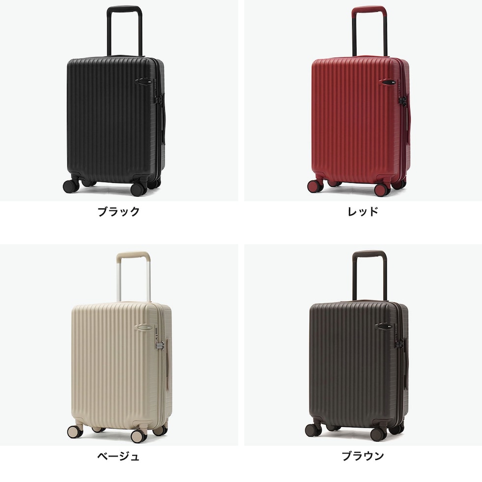 | 機内持ち込みで自由旅 身軽に動ける快適さ 洗練されたデザインと落ち着いたマットカラーが魅力の『ウィーベルZ』シリーズ。こちらは機内持ち込み対応のコンパクト設計ながら、拡張機能を備え、35Lから最大42Lへ容量アップが可能。なお、機内持ち込みが可能なのは拡張前のサイズのみとなっており、拡張時は規定サイズを超えるため預け入れが必要となります。静音ダブルキャスターとキャスターストッパーを搭載し、移動中の安定性と快適さを両立。ビジネスから観光まで幅広いシーンに自然に馴染む高機能キャリーケースです。 |