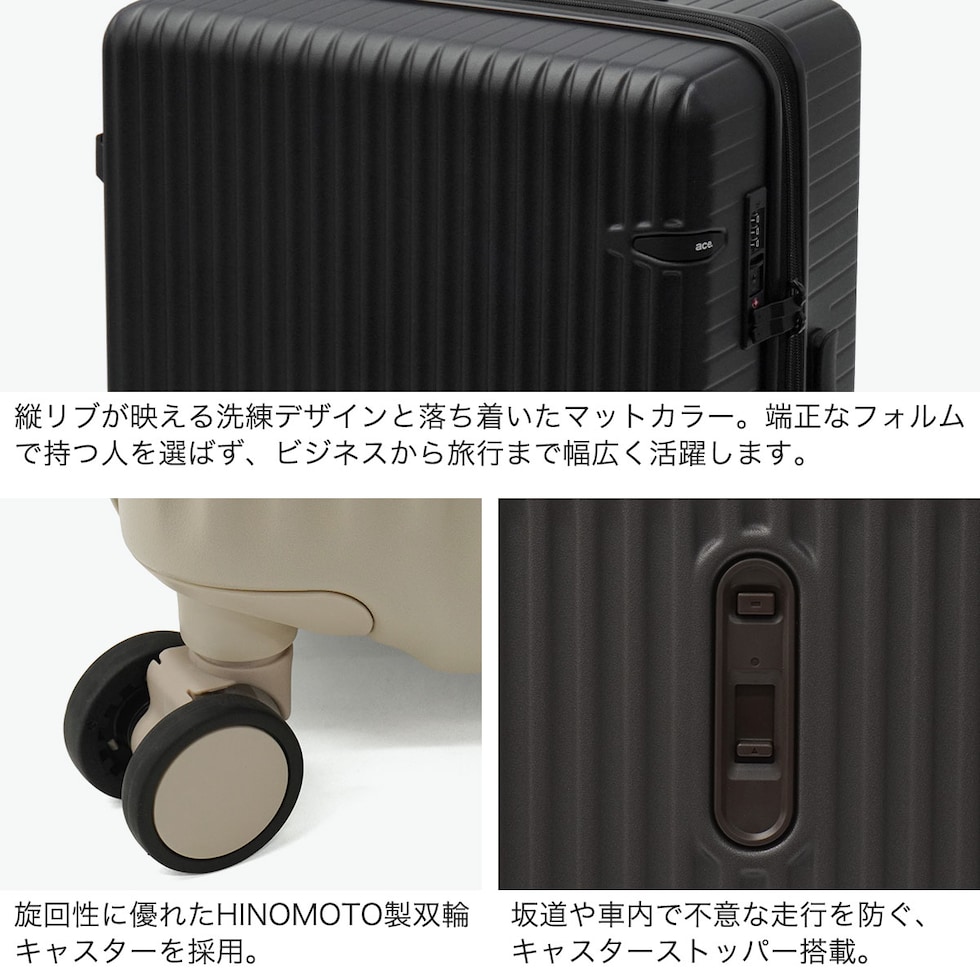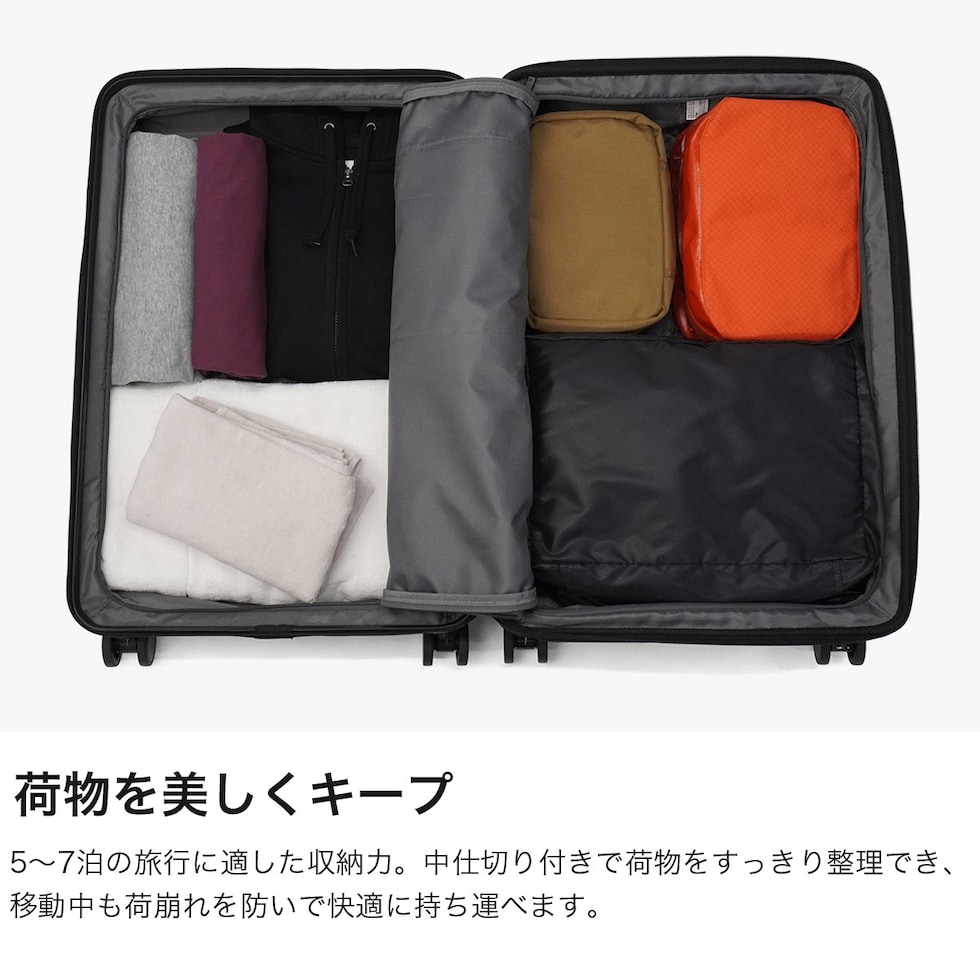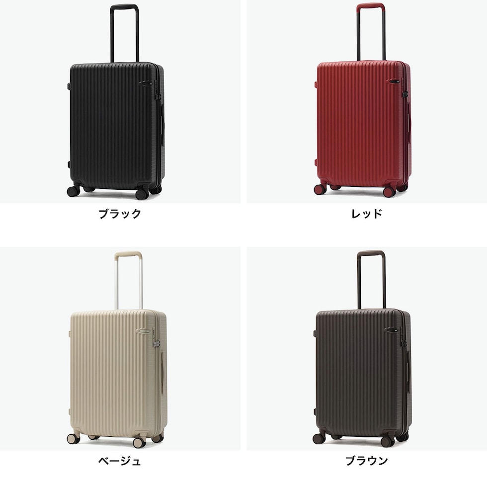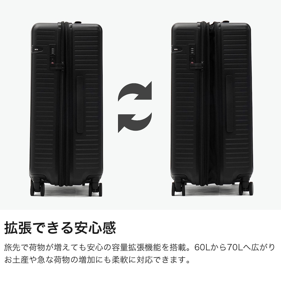 | 静音キャスターで快適 ストレスフリーな旅時間 洗練されたデザインと落ち着いたマットカラーが魅力の『ウィーベルZ』シリーズ。こちらは60Lの使いやすい容量に加え、拡張機能で最大70Lまで対応し、荷物が増える旅行でも安心。さらに、静音ダブルキャスターとキャスターストッパーを搭載し、移動中の安定性と快適さを両立。ビジネスから観光まで幅広いシーンに自然に馴染む高機能キャリーケースです。 |