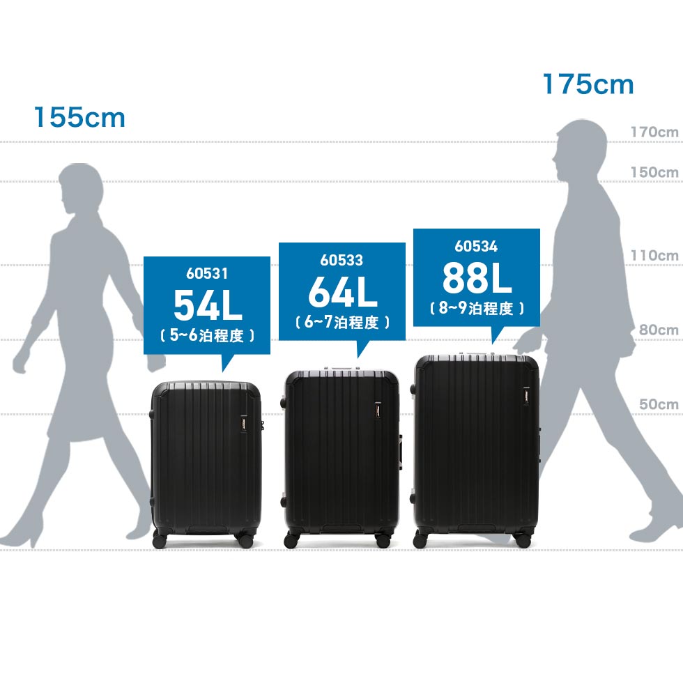 ・エキスパンダブル機能付きの製品は、マチ拡張時の3辺の和が機内持ち込みサイズ、預け入れ無料サイズを超える場合がございます。また、航空会社や飛行機の機種などによって規定が異なりますので、予めご確認の上お求めください。