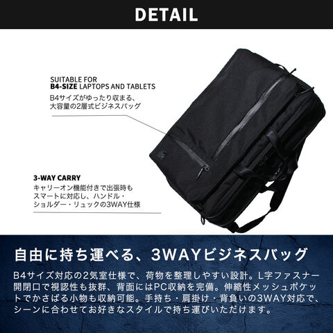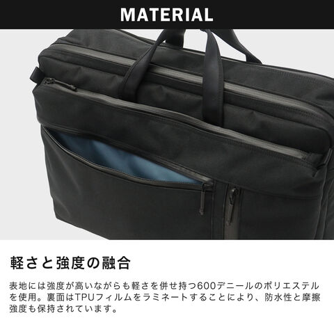 | 仕様 | <外側> PC収納×1 メッシュポケット(M)×2 <内側> ジップ収納×2 メッシュジップポケット(M)×2 ジップポケット(M)×1 ジップポケット(S)×2 <付属品> ロゴ入りクリアポーチ |