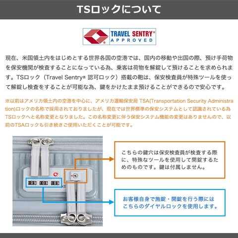 | <購入前にご確認ください> ・メーカーの意向により、付属品の収納袋や箱、製品の仕様やデザインは予告なく変更となる場合がございます。 ・下記による返品・交換はお受けすることができませんので、予めご了承ください。 └ 製品の性質上による細かいキズや塗装ムラ、気泡などがある場合。 └ 配送用の段ボールにキズ、汚れ、破損がある場合。 ・エキスパンダブル機能付きの製品は、マチ拡張時の3辺の和が機内持ち込みサイズ、預け入れ無料サイズを超える場合がございます。また、航空会社や飛行機の機種などによって規定が異なりますので、予めご確認の上お求めください。 ※機内持ち込みサイズ目安表はこちら ・荷物をお預けの際は、キャスターストッパーをOFFにしてください。 ※すべての製品にキャスターストッパーが装備されているわけではありません。 ・水濡れ(雨・汗など)や日焼けにより、色落ち、退色する恐れがございます。商品のお取り扱いには十分にご注意ください。 ・柄の位置やカラーバランスなどは、生地の裁断や製造過程、素材の特性により画像とは異なる場合がございます。商品をお選びすることはできませんので、予めご了承ください。 ・極力実物に近い色味を再現しておりますが、モニター等の条件により画面上と実物では色味が異なって見える場合がございます。 |