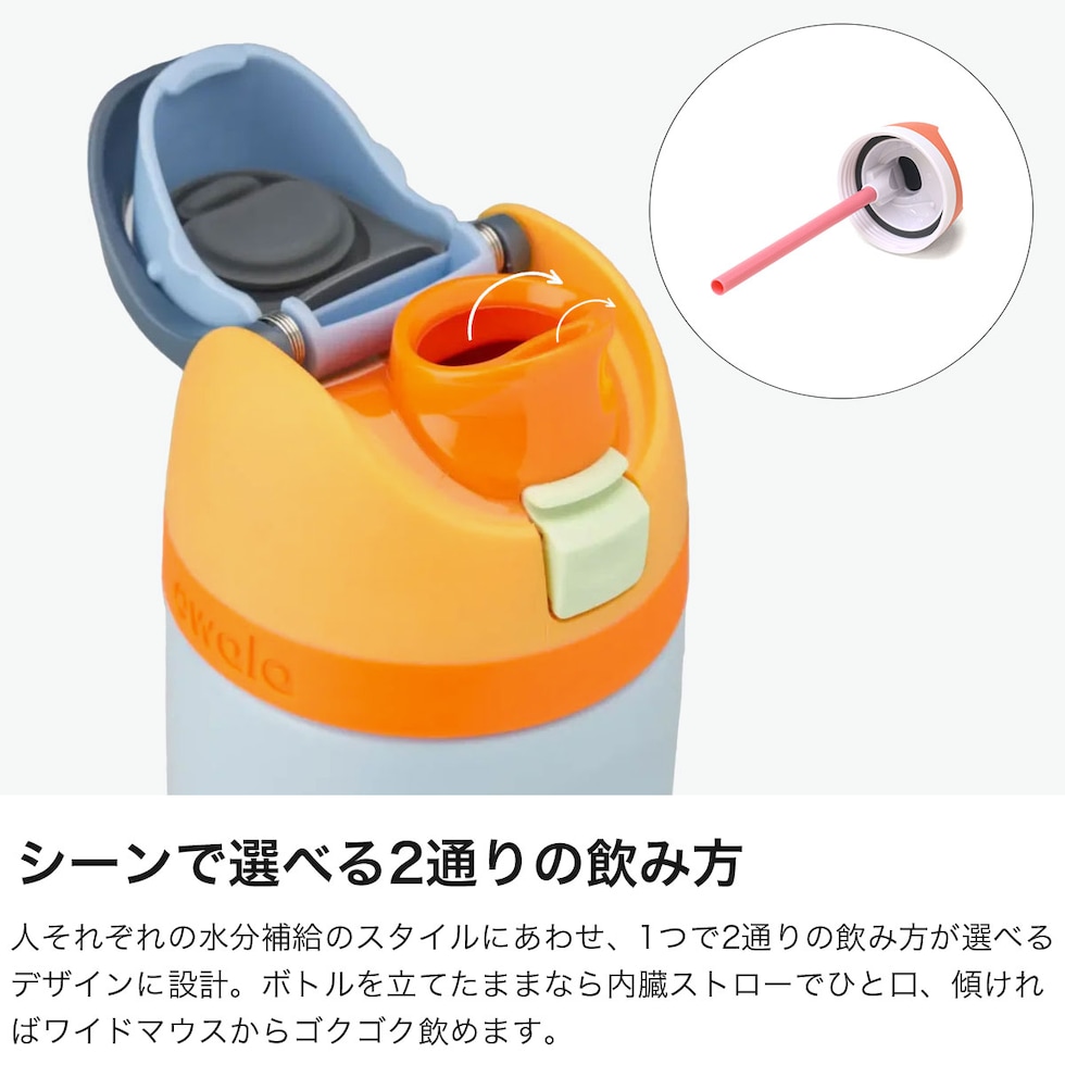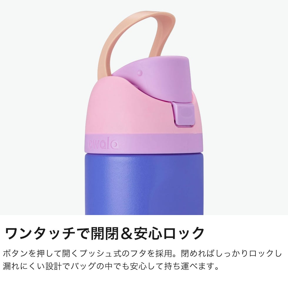 アメリカで誕生したボトルブランド『owala/オワラ』。こちらは、ストロー飲みと直接飲みの両方が可能な革新的なボトル「FreeSip」シリーズの16ozステンレス製ボトル。ボトルを立てたままなら内蔵ストローでひと口、傾ければワイドマウスからゴクゴクと飲み方を選べる設計。ボタンを押すだけでワンタッチでフタが開き、閉めればしっかりロックが可能な完全漏れ防止設計で、バッグの中に入れて持ち運んでも安心です。氷が入れやすく洗いやすいワイドな飲み口と、持ち運びに便利なキャリーループ付きと機能的。普段使いからアウトドアシーンまで幅広く活躍してくれます。