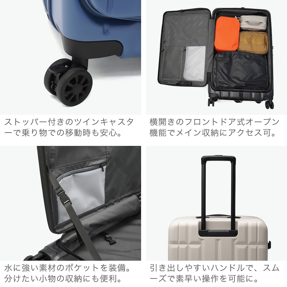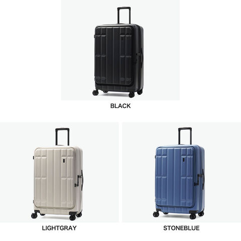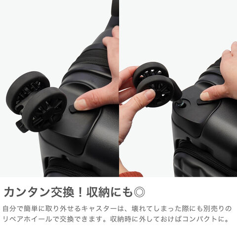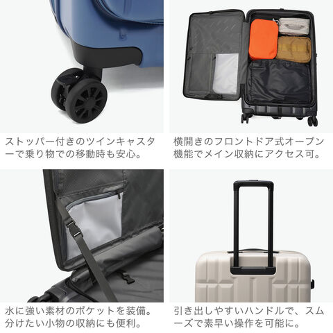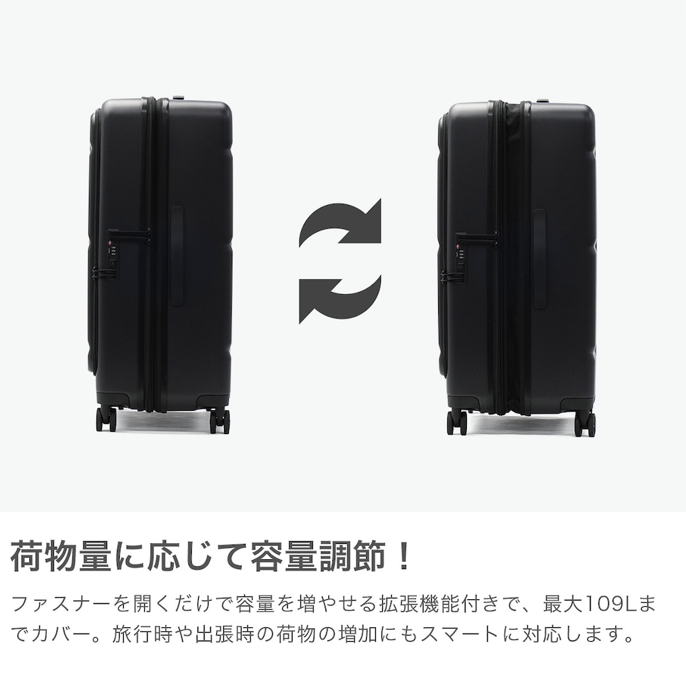 大容量スーツケース キャスターが"トレル"のが特徴の『TORERU』シリーズのスーツケース。ストッパー付きキャスターは簡単に取り外しが可能な作りで、外出から戻った際に汚れたキャスターを外してお手入れができるのが高ポイント!横開きタイプのフロントドア式オープン機能を採用し、収納部にアクセスしやすい構造。101L~109Lまで容量アップできるエキスパンダブル機能を装備し、荷物が増えた際にも安心です。 |