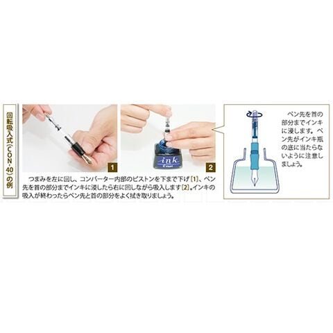 別売りのコンバーターを装着し、ペン先を首の部分までインキに浸してそれぞれの吸入方法(回転吸入式・プッシュ式)で吸入し使用します。