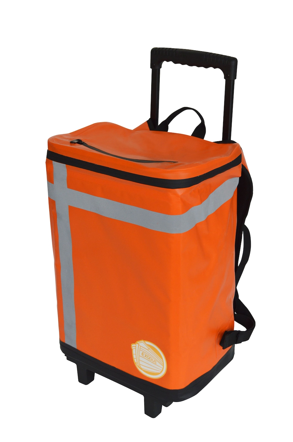 ■ キャスター付ローリングバッグは、①密閉防水で「浮き具」(ライフジャケットL1相当の浮力)になり、急増する津波・洪水等でも浮いて命を守れます ②キャスターとバッグは分離可能、バッグを背負い、キャスターで重量物(耐荷重:約25kg)が運べ、長期避難生活でも便利。