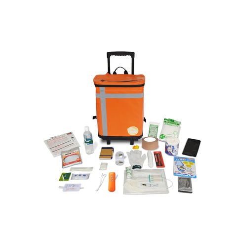 ■ すっきりしたデザイン・丈夫で破れにくいターポリン素材採用。ご家庭だけでなく、オフィスや学校にも設置しやすく、場所を取りません。背負う・引いて転がす・手持する、3通りの運び方が可能ですから、高齢者や女性等、年齢を問わず、誰でもすぐに持出せ、楽に運べます。