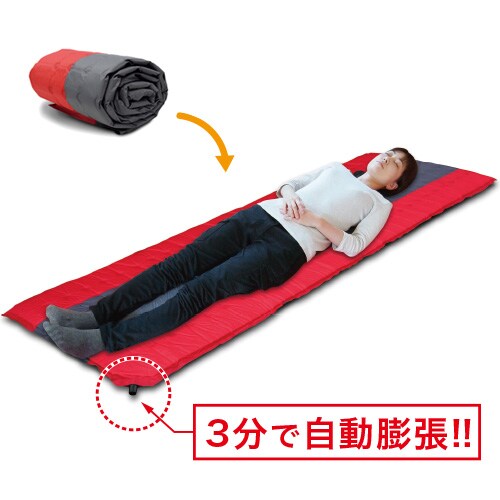 ●マットレスは栓をゆるめるだけで自動膨張。3分で柔らかマットレスが完成。避難所等の板床や、地面の固さをやわらげます。