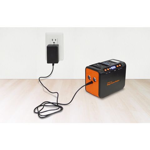 ACアダプターの差込プラグを家庭用コンセントに差し、反対側の丸プラグを蓄電池のDC入力に差すと充電ができます。約5時間でフル充電になります。