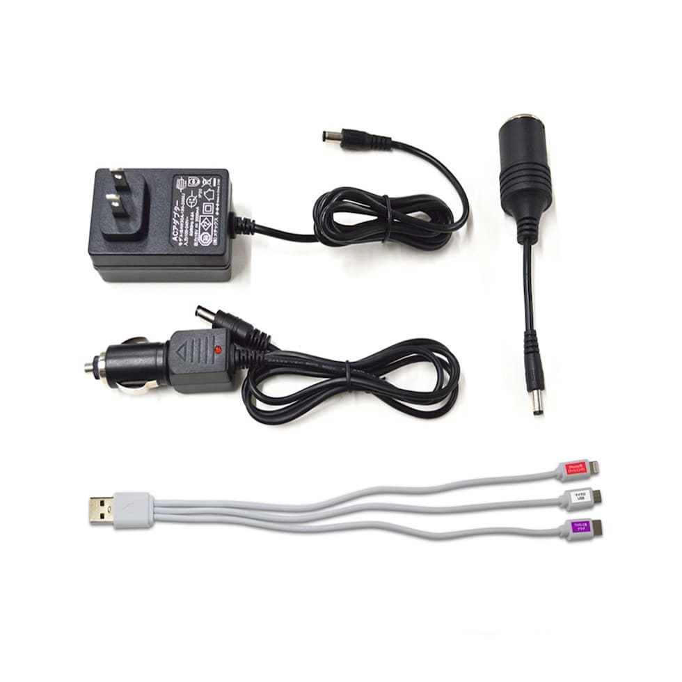 付属品:ACアダプター、カーシガレットチャージャー(入力用)、シガレットライターアダプター(出力用)