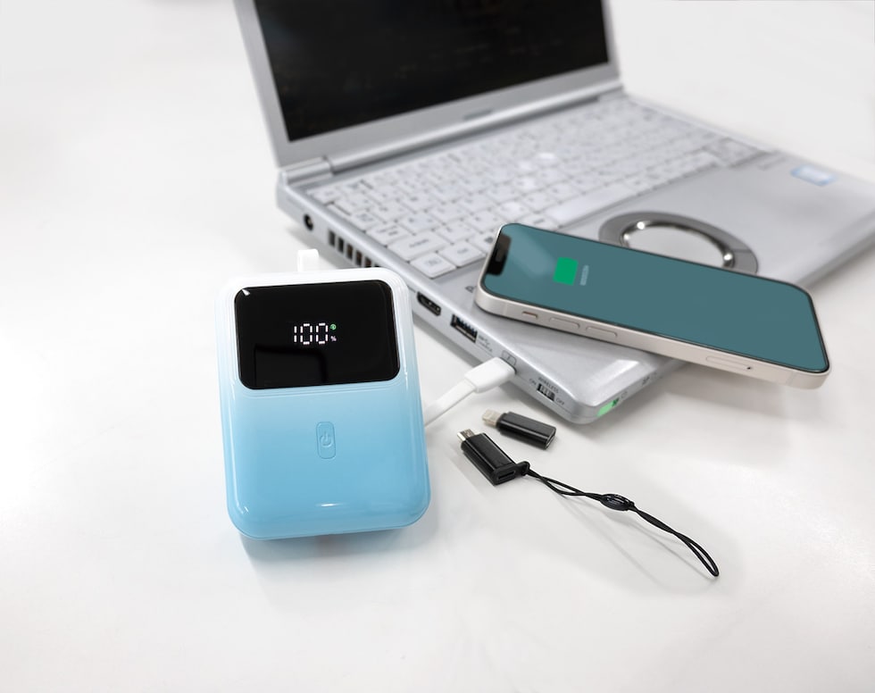 ● タイプCケーブル内蔵、ライトニング・マイクロUSB変換アダプターも付属