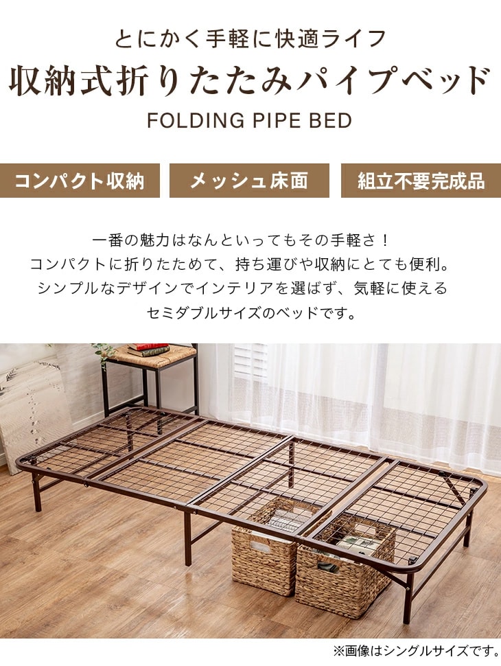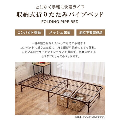 収納式折りたたみパイプベッド セミダブル ブラウン 完成品 折りたたみベッド ベッドフレーム パイプベッド
