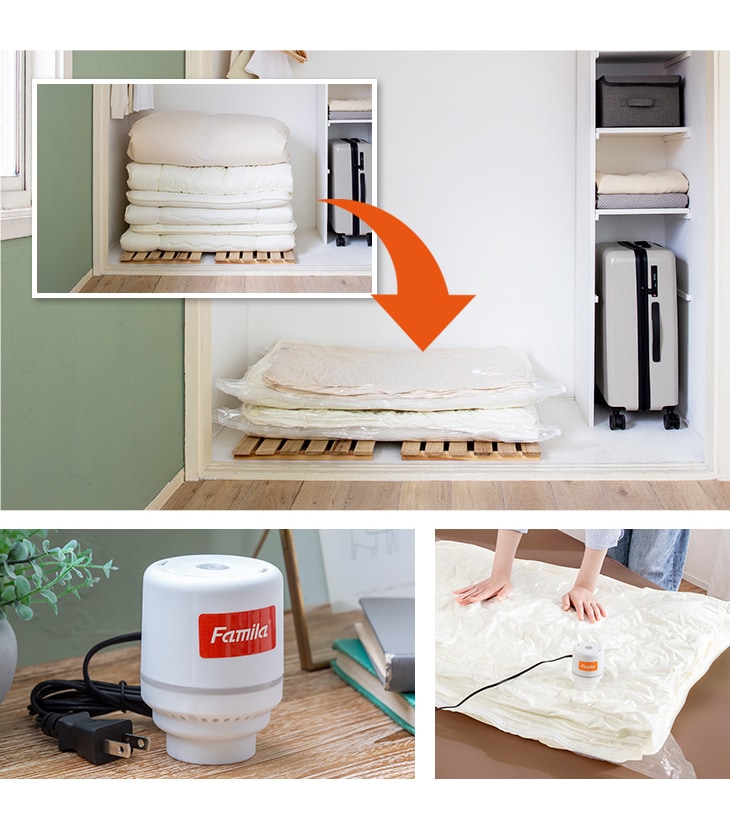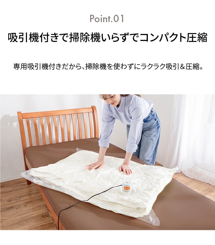掃除機いらずでコンパクト圧縮。簡単・便利な布団圧縮袋セット。専用吸引機付きだから、掃除機を使わずにラクラク吸引&圧縮。二重チャックを採用しているので、空気漏れを防ぎ、密封性に優れています。専用吸引機は小型ながら優れた吸引力。竹炭シート布団用には消臭・カビ・ダニを抑制する竹炭シート付きで旅行に便利な衣類圧縮袋付き。くるくるっと巻いて圧縮できます。