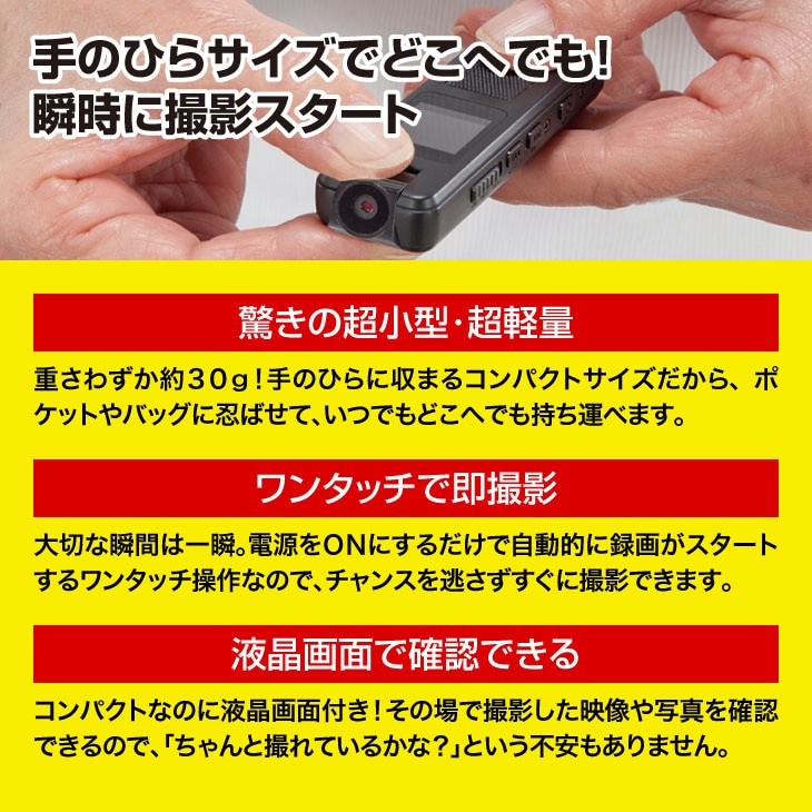 簡単操作でプロの仕上がり!多機能小型マルチレコーダーセット。録画・録音・写真、これ一台でOK!撮りたい瞬間を逃さない!「操作が難しいのはちょっと…」そんな心配は無用です!この小型マルチレコーダーは、ボタン一つ押すだけで録画、録音、写真撮影がすぐにスタート!
