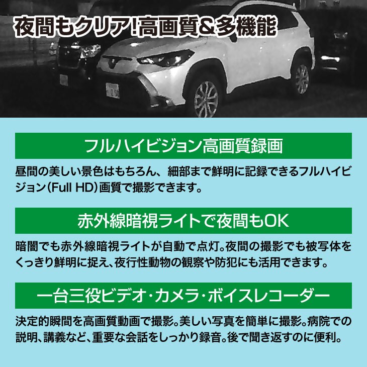 ●仕様/電源:USB充電式(リチウム電池内蔵)、電圧:DC5V/1A、保存形式:microSDカード(32GB~256GBまで)、バッテリー持続時間:最大約3時間、ファイル形式動画:AVI・写真:JPG、動画解像度:1080p(1920×1080)、録画モード:通常録画モード・夜間録画モード(赤外線ライト)、画像サイズ最大:7040×4992、PC互換性:Windows2000以降・Mac:OS10.5以降、機能:動画撮影・写真撮影・録音、ループ録画・赤外線ライト(夜間録画)